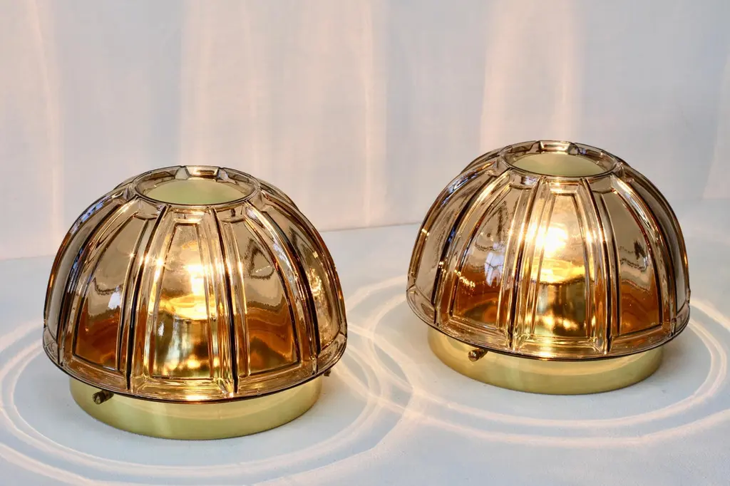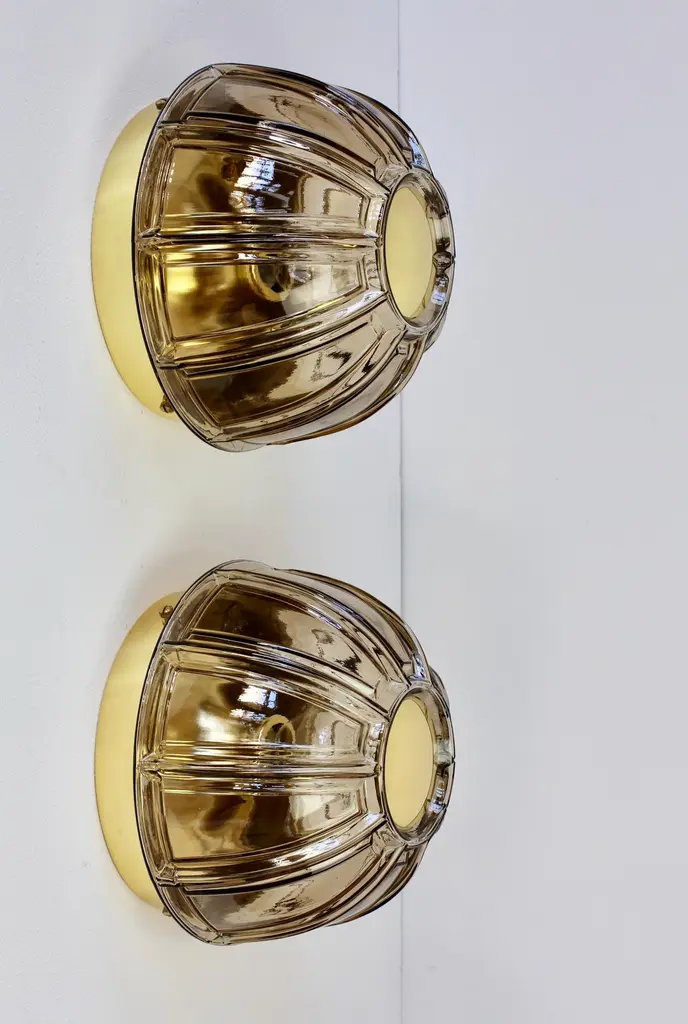 One of a pair of funky vintage mid-century modern wall lights or sconces designed by the Swedish interior designer Hans-Agne Jakobsson for German lighting manufacturer Glashütte Limburg, circa 1975-1985. Featuring geometric shaped mouth blown topaz dark "smoked" toned textured glass elements with polished brass mounts and reflector crowns - which are perfect for avoiding direct glair - very useful in the bedroom, bathroom or hallway for example.Each light requires a single E27 (E26 for the US) light bulb (75Watt Max.) Newly rewired.Two available - priced individually.