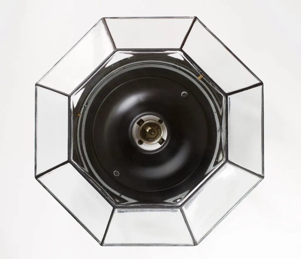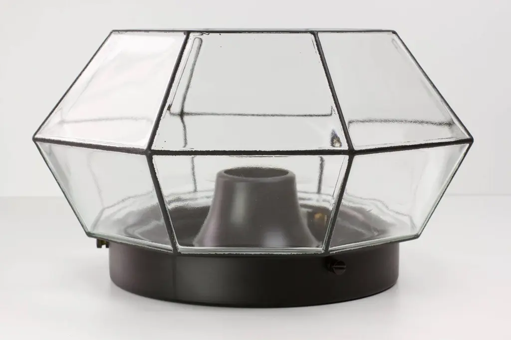 One of four vintage Minimalist German made wall or ceiling flush mount light fixtures by Glashütte Limburg, circa 1970s. The simple, yet striking, clean lined modernist design looks effortlessly timeless and would fit equally well into any midcentury home as well as any modern home decor design. The octagonal or geometric shape combined with the sleek black lines result in a futuristic lantern style sconce which is sure to be a big hit and a conversation piece in any home.Newly wired. The lights require a single E27 screw fit light bulb (100 Watt max.)Four available, (priced individually).