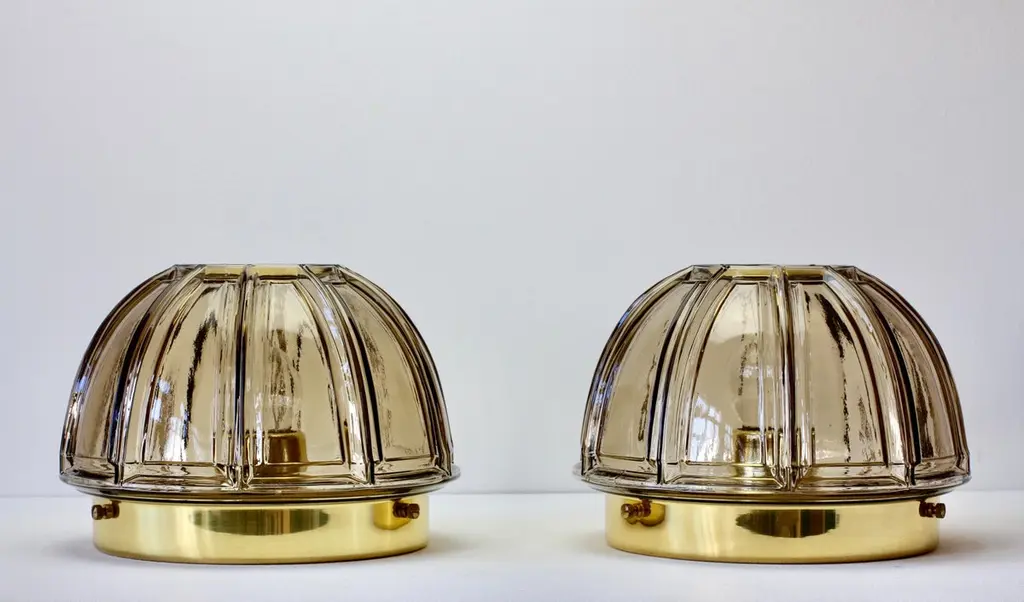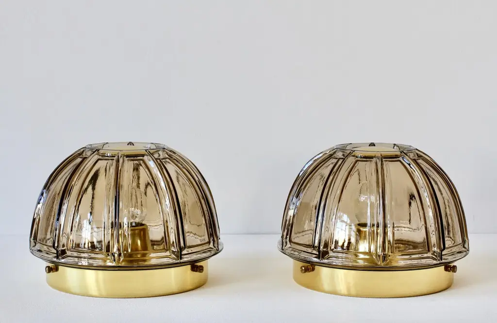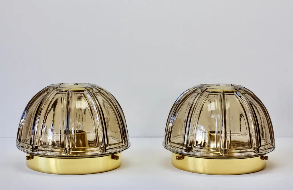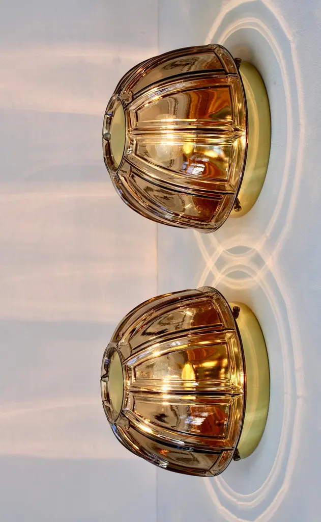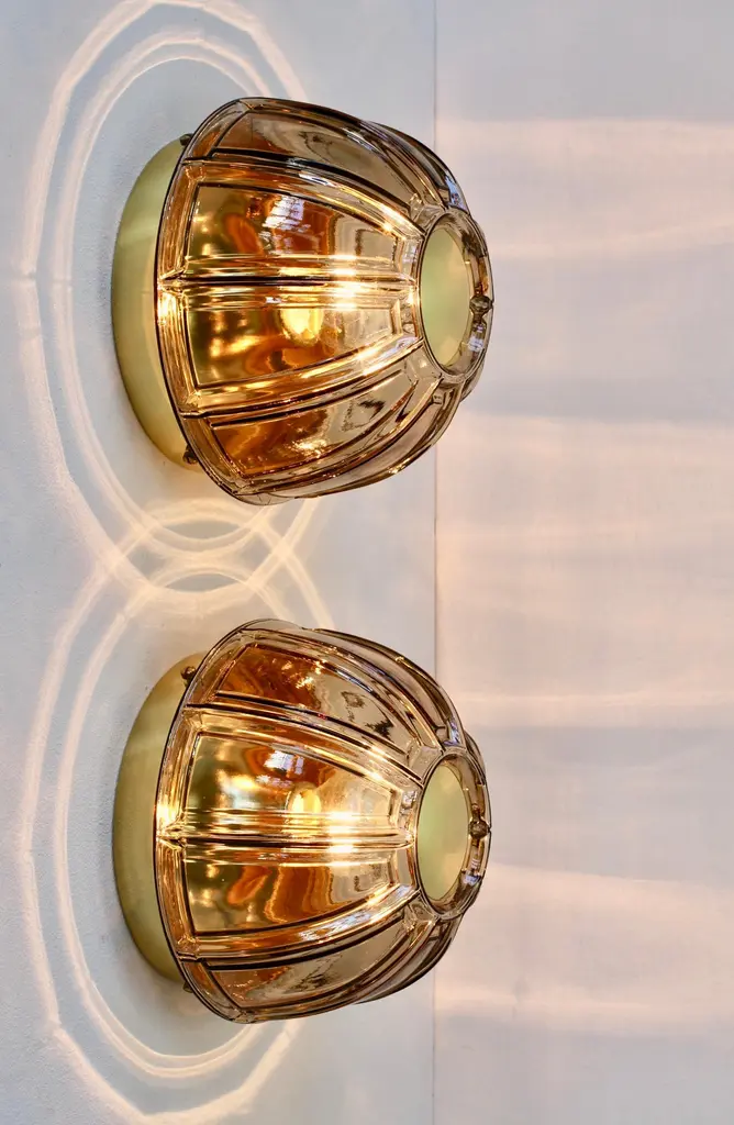 One of a set of five funky vintage midcentury wall lights or sconces by German lighting manufacturer Glashütte Limburg, circa 1975-1985. Featuring geometric shaped mouth blown topaz dark "smoked" toned textured glass elements with polished brass mounts and reflector crowns - which are perfect for avoiding direct glair - very useful in the bedroom, bathroom or hallway for example.Each light requires a single E27 (E26 for the US) light bulb (75Watt Max.) Newly rewired.Five available - priced individually.