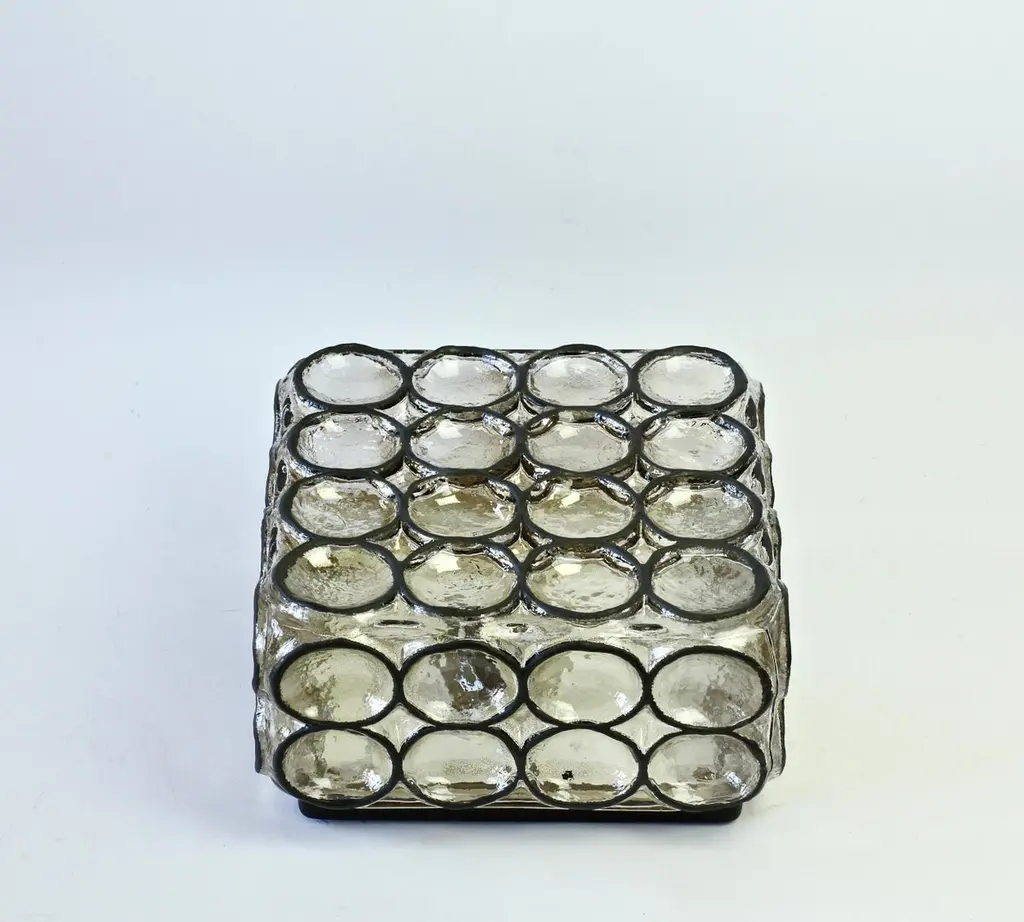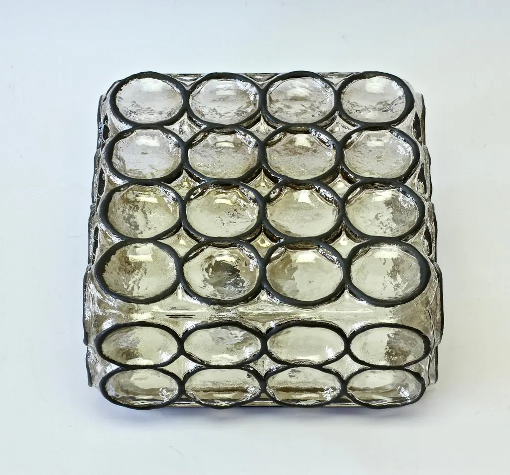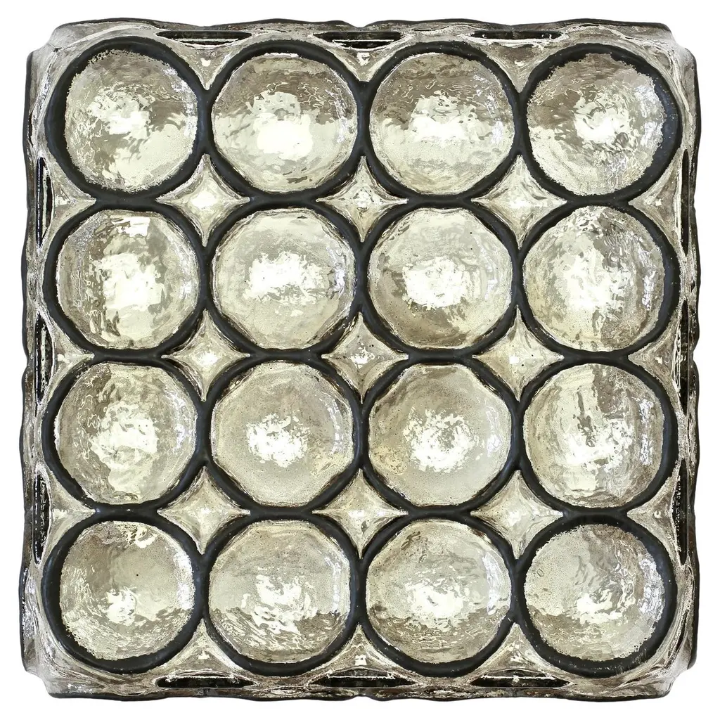 One of a four of vintage Mid-Century Modern square iron rings and glass flush mount light / sconce by Glashütte Limburg, Germany, circa 1965. These, German made, lamps feature thick heavy mouth blown glass with con-caved round "iron" rings - reminiscent to the bullseye circular discs found in British and European windows from the late Middle Ages or late medieval period, also known as 'crown glass' or 'crown bullion glass'. This style of lights cast a wonderful light across a wall or ceiling and fit into almost any style of home, be it modern, midcentury, Edwardian, Victorian, Georgian, Hollywood Regency or Contemporary. Four available - priced and sold individually or can be purchases in a pair or set.Model number 2650.Newly rewired to EU standards - each light fixture requires a single 75 Watt E27 or E26 for US customers.