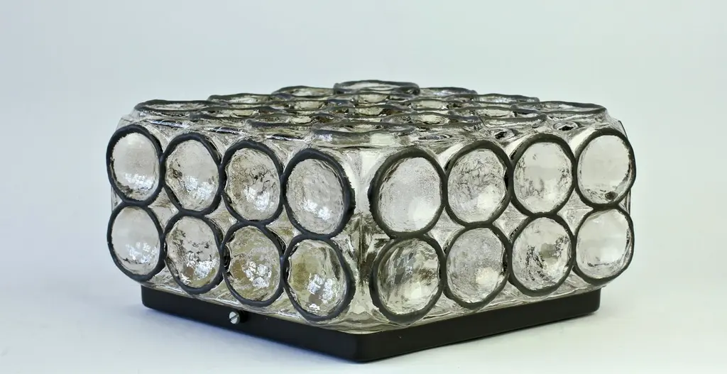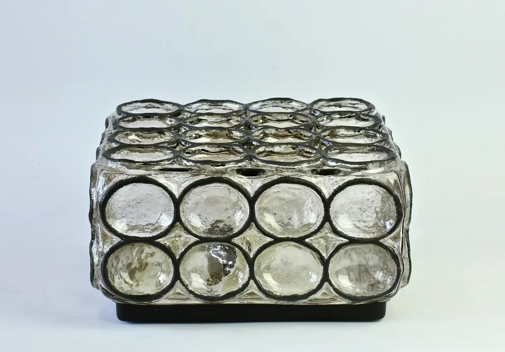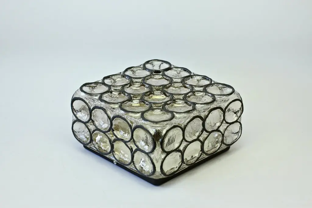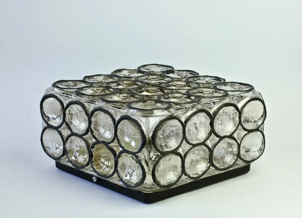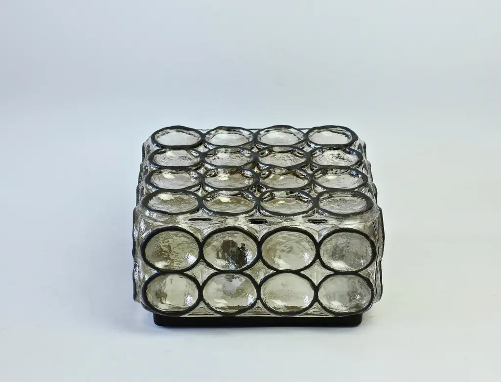 One of a four of vintage Mid-Century Modern square iron rings and glass flush mount light / sconce by Glashütte Limburg, Germany, circa 1965. These, German made, lamps feature thick heavy mouth blown glass with con-caved round "iron" rings - reminiscent to the bullseye circular discs found in British and European windows from the late Middle Ages or late medieval period, also known as 'crown glass' or 'crown bullion glass'. This style of lights cast a wonderful light across a wall or ceiling and fit into almost any style of home, be it modern, midcentury, Edwardian, Victorian, Georgian, Hollywood Regency or Contemporary. Four available - priced and sold individually or can be purchases in a pair or set.Model number 2650.Newly rewired to EU standards - each light fixture requires a single 75 Watt E27 or E26 for US customers.