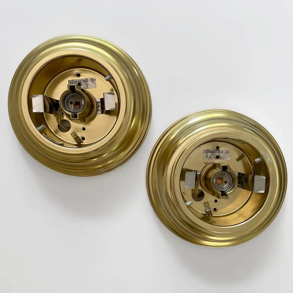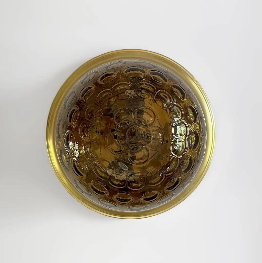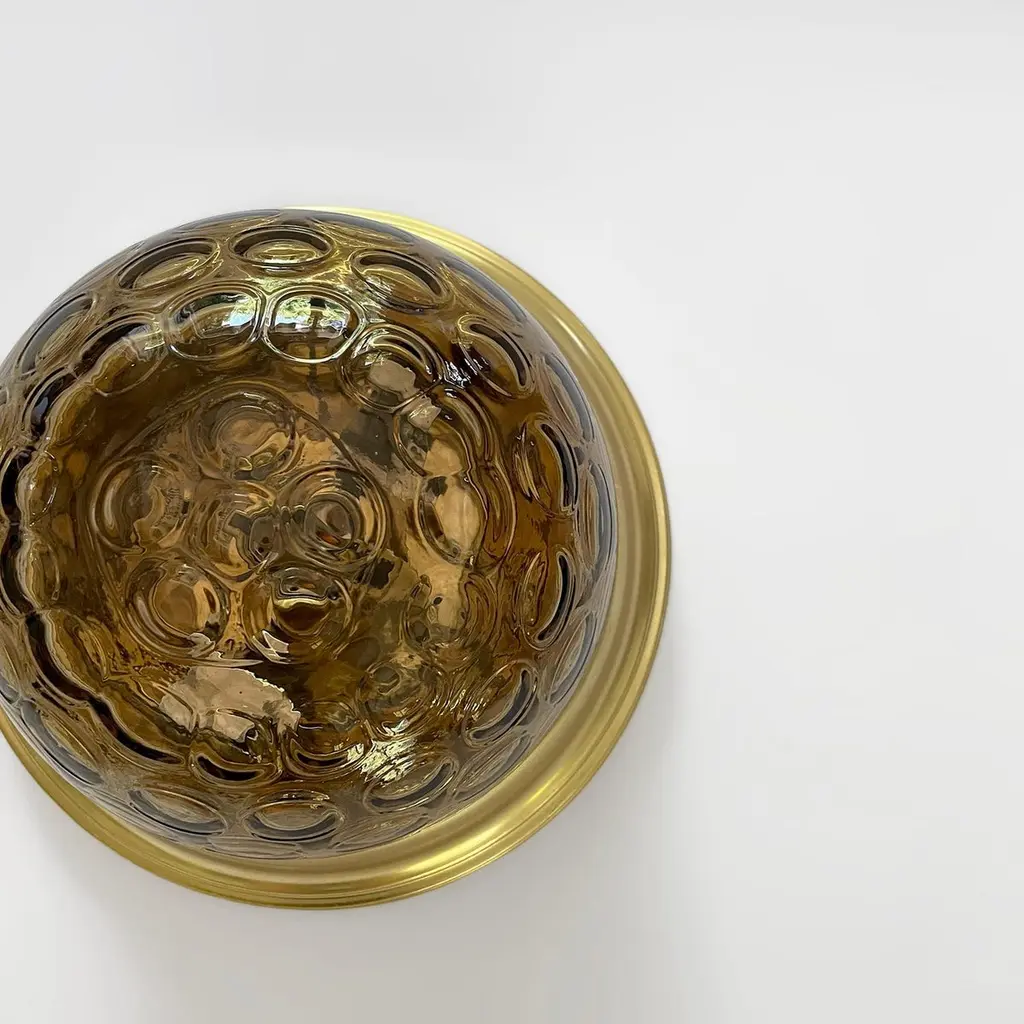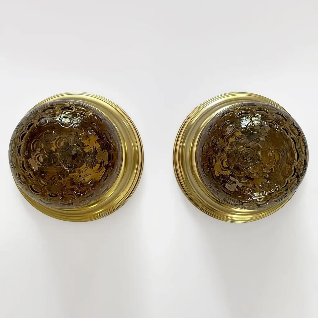 Limburg bubble glass wall lightsHelena Tynell for Glashütte LimburgGermany, circa 1960sEach handblown bubble glass dome is unique in its composition and detailsEmits a beautiful warm and diffused lightCan be used as a sconce or ceiling fixture Patina from age and useMinor grazing and loss around the perimeter of the glass shades which is not visible once assembled Both lights are structurally soundPlease reference photosTwo lights availablePriced and sold individually