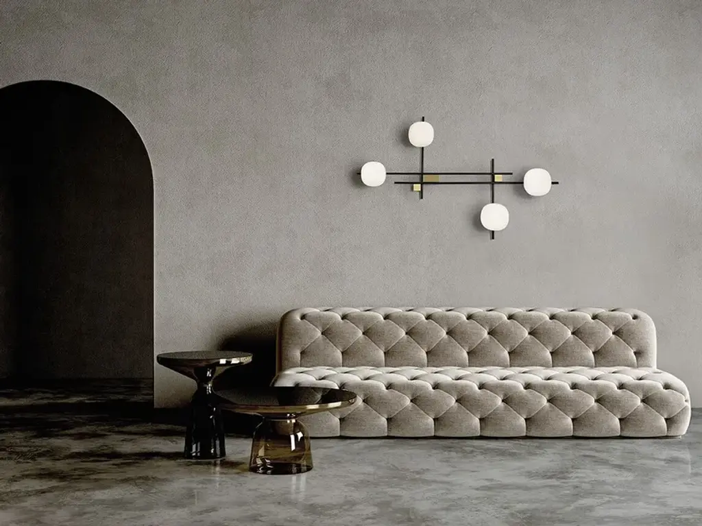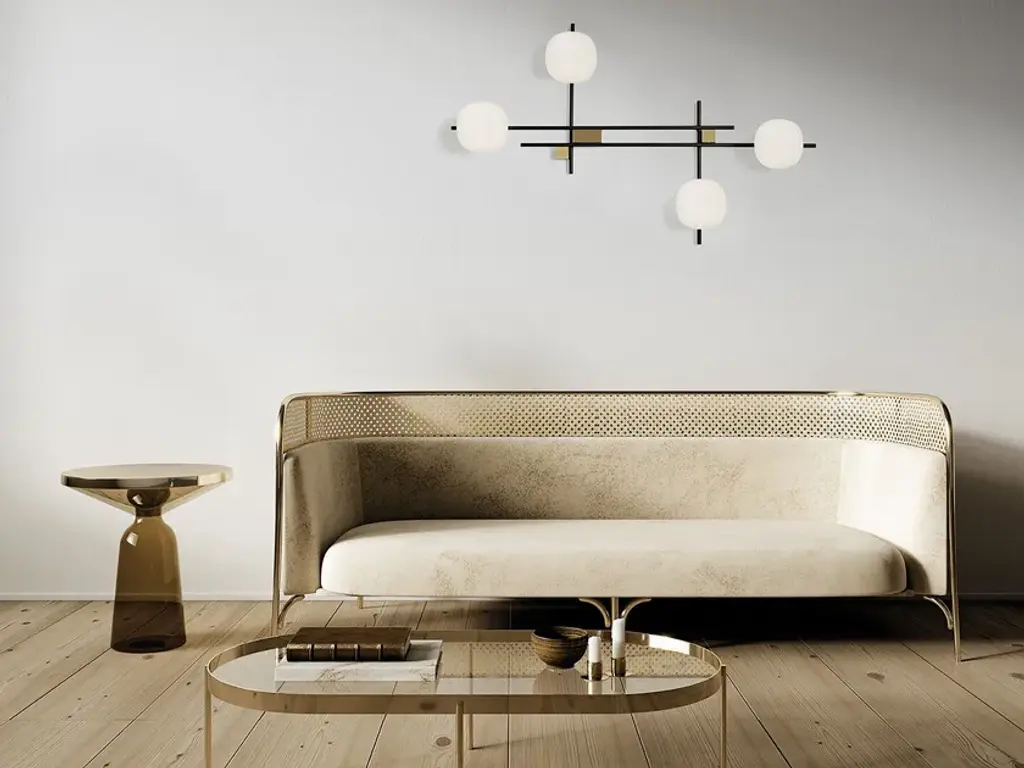 Wall lamp from the LINGOTTO collection in black metal, with brushed gold and gold-pink details. Blown opaline glass, rounded shape.Light source: G9, Power: 4x10WRigour made lamp. LONGOTTO's orthogonal structure lends severity to the composition, the brushed gold and rose gold finishes of the three-dimensional elements enhance its preciousness, and the square-shaped opaline glass, housing the light points, amplifies its linearity. LONGOTTO, with its mere presence, enriches every context in which it is inserted, like a work of art of inestimable value.