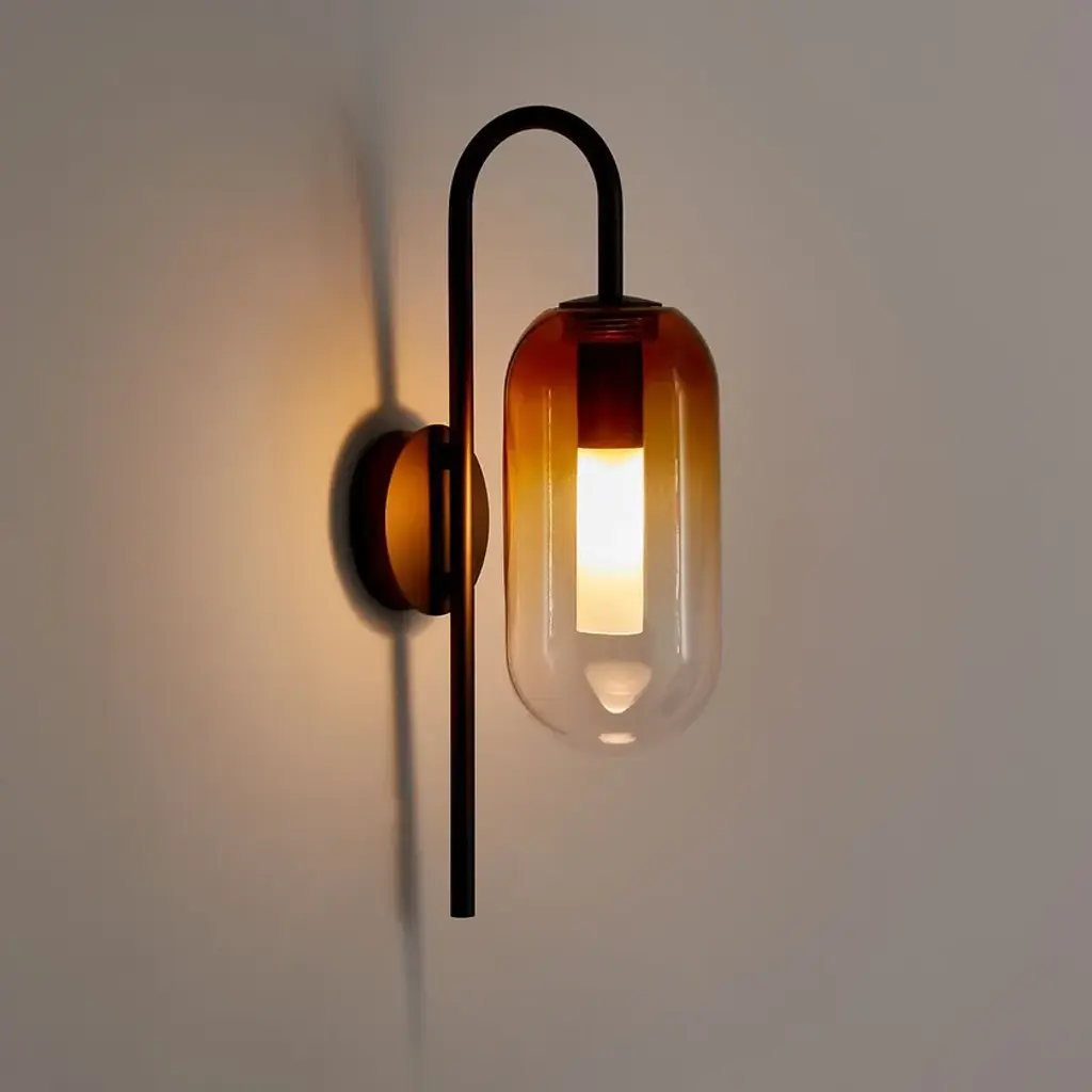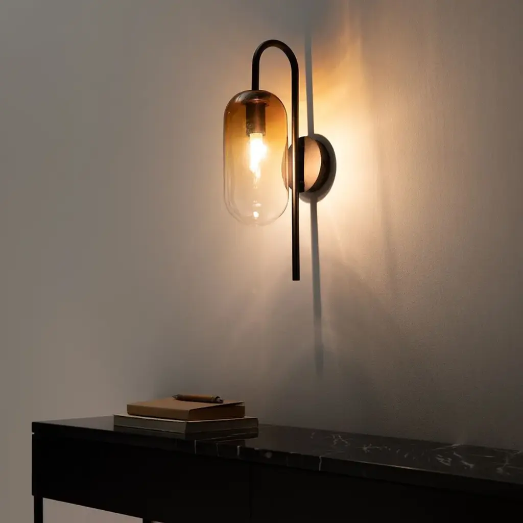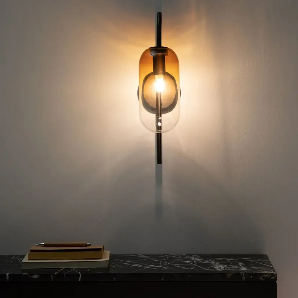 A generous capsule shape, the combination of a shaded amber glass globe and a frosted glass diffuser, and a high-quality metal frame give the Linterna wall lamp elegance, lightness and a warm, soft light diffusion.Amber glass globe and satin-finish glass diffuser insideIron frame with gunmetal finishG9 lamp holder for 6W bulb max (not included)