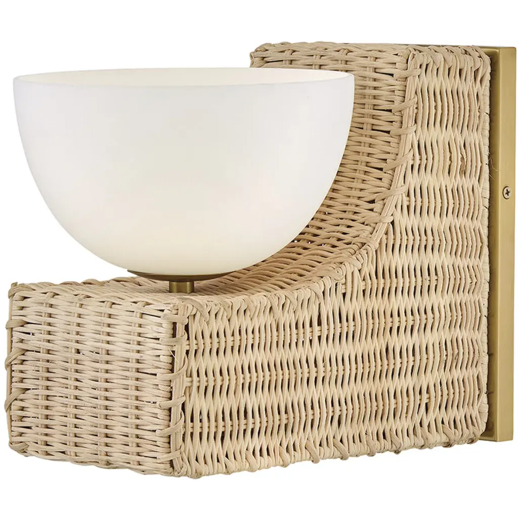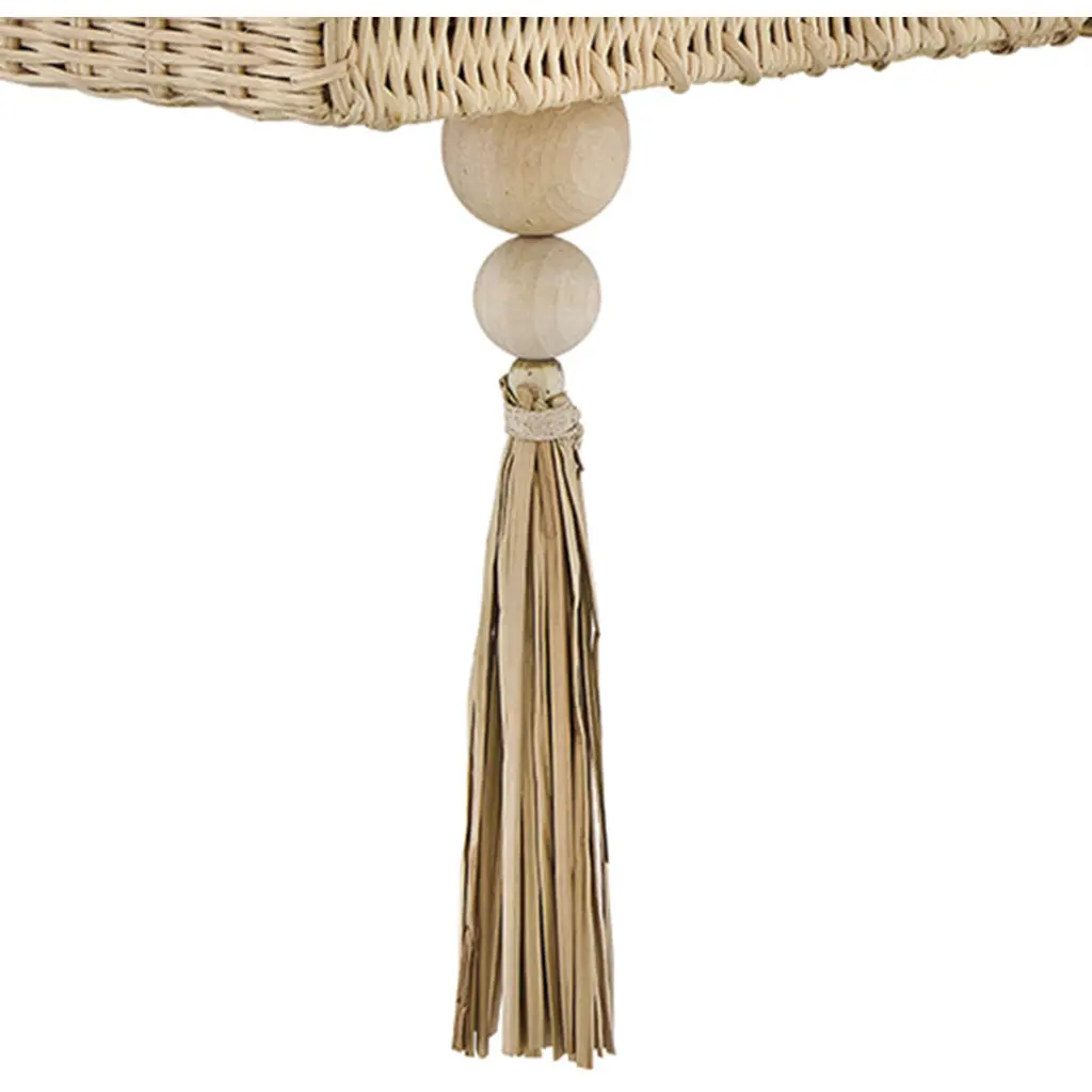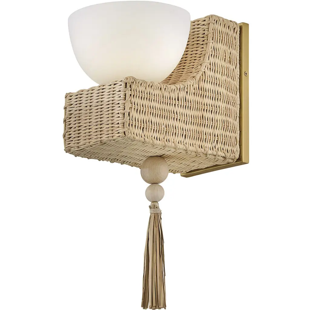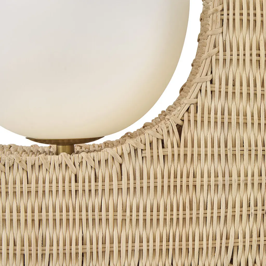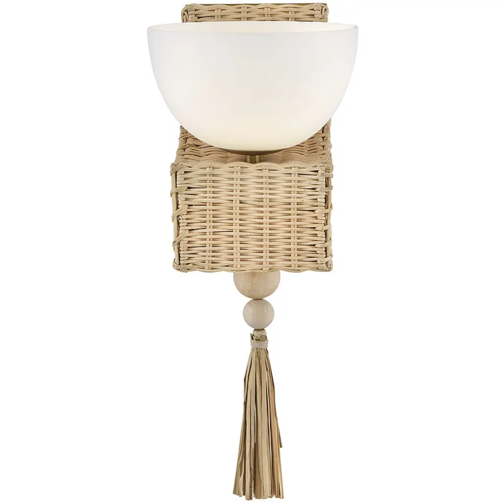 The Lisa McDennon Collection offers a striking mix of edgy, sculptural silhouettes that incorporate modern, organic elements and luxe materials, brought to life by her innovative and original point of view. Named after a beach in Laguna, California, marked by a single, large palm leaf umbrella in the sand Thalias distinctive, whimsical woven design evokes the relaxed, carefree spirit of coastal living. Natural raffia is complemented by a shallow opal glass bowl, and a playful tassel adds a fun bohemian touch that can be removed for a more streamlined look.