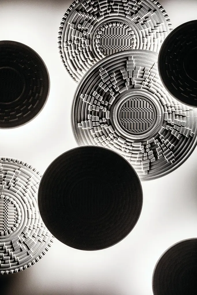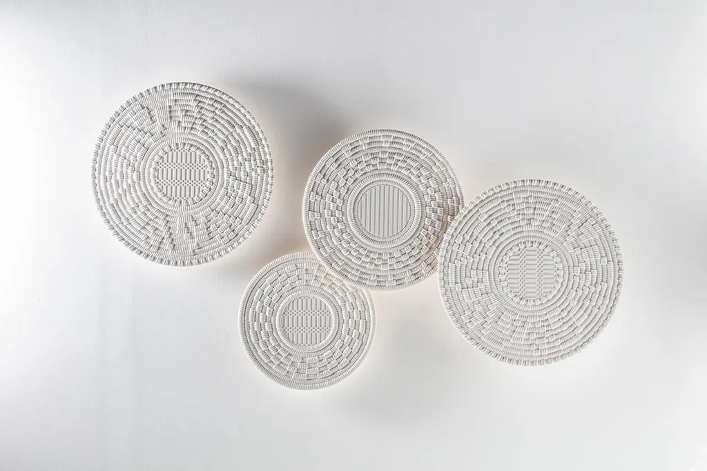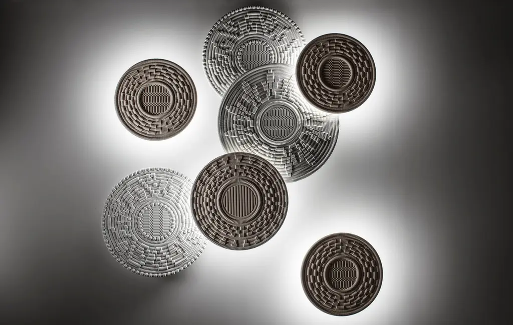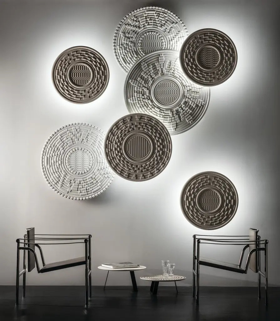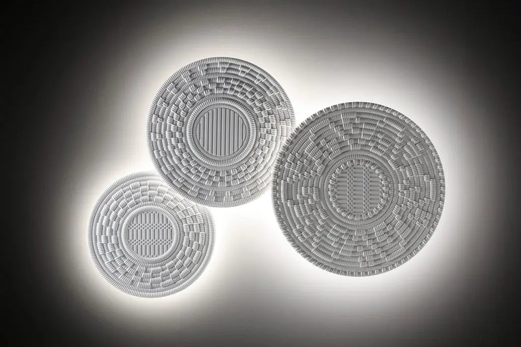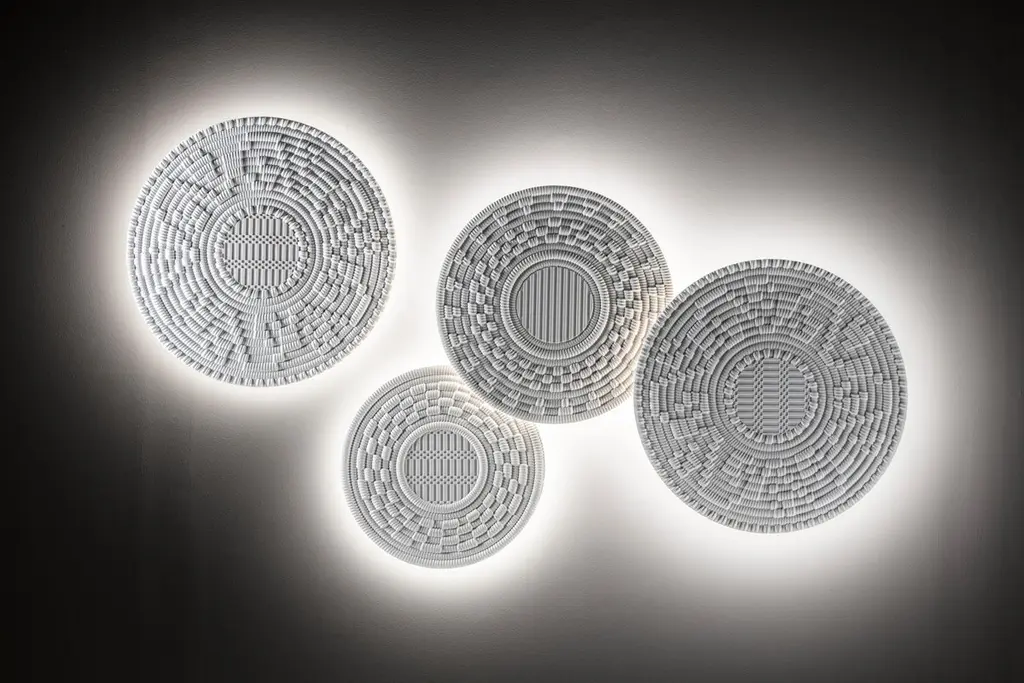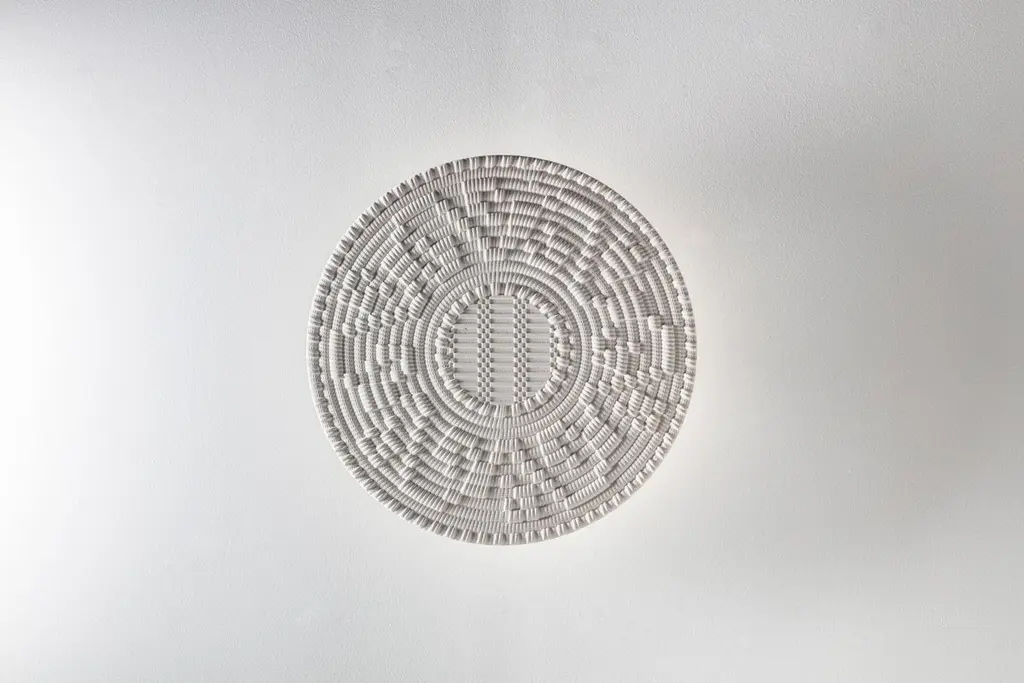 Corbulas 90This superb, three-dimensional round panel is fashioned of Bianco Diocleziano marble. The pattern reproduced on the surface evokes the elaborate underside of traditional Sardinian baskets, used to hold and measure flour as well as colorful decoration on domestic walls. The striking effect of this panel is enriched by LED lights.