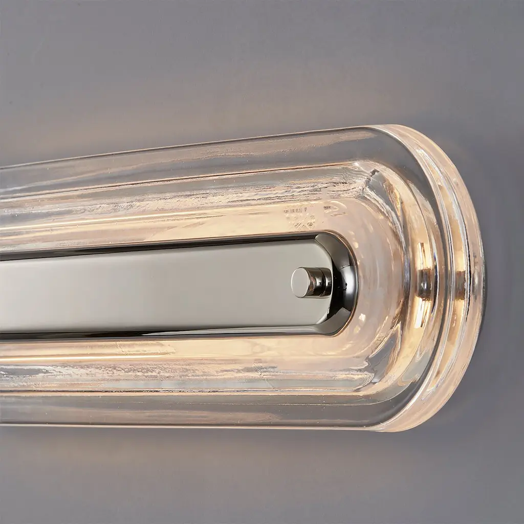 Litton layers smooth, clear cast blonchino glass, and glass with a linear metal core for a luxurious design. These stylish sconces can be mounted vertically or horizontally, adding elegance to a fireplace or a touch of glamour in the bath.