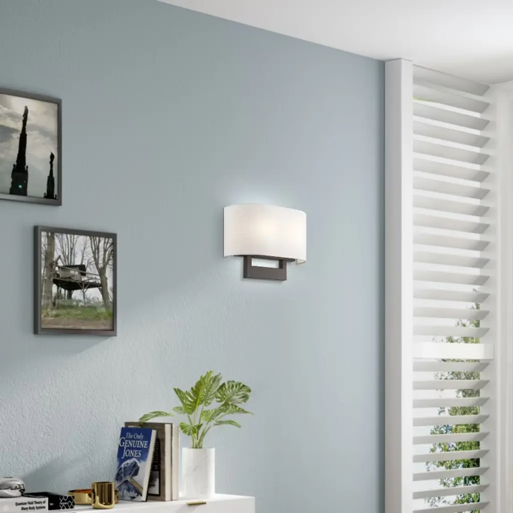 Material: Steel, Finish Color: Bronze, Width: 13", Height: 9", Depth: 3.95", Height From Outlet Box: 3.25", Backplate Width: 10", Backplate Length: 6", Lamping Type: Incandescent, Number Of Bulbs: 2, Wattage: 40 Watts, Moisture Rating: Dry Rated, Desc: Raise the style bar with a designer medium ADA sconce in a handsome and versatile contemporary manner. This two light wall sconce comes in an antique brass finish with a rectangular off-white fabric hardback shade.,