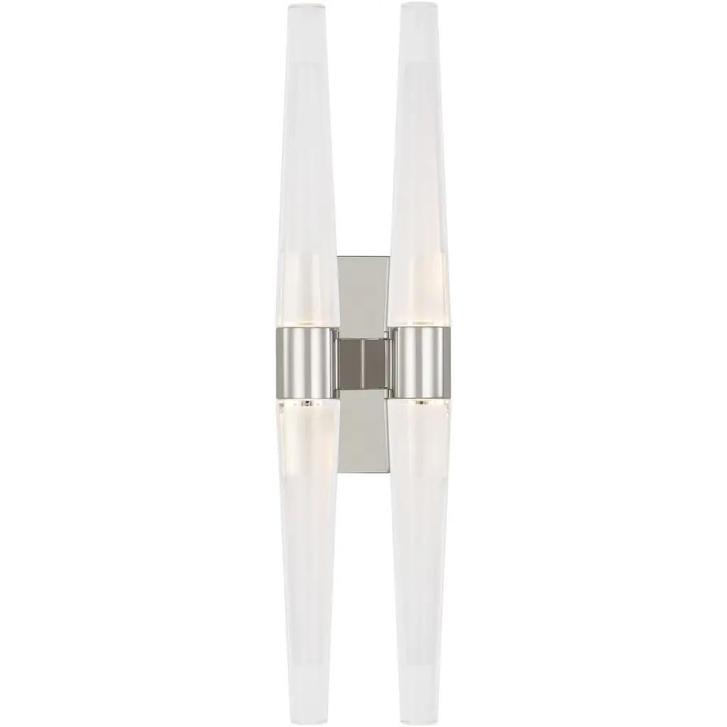 Collection: Acra, Material: Steel, Finish Color: Brushed Nickel, Width: 5.13", Height: 22", Depth: 3.25", Height From Outlet Box: 15", Backplate Width: 5.13", Backplate Length: 0.75", Lamping Type: Incandescent, Number Of Bulbs: 2, Wattage: 40 Watts, Moisture Rating: Dry Rated, Desc: The minimalistic Acra collection was inspired by the industrial landscape of metropolitan cities across Europe and Asia. Delicate tubular shapes are interrupted by clever cutouts to create a visually interesting light distribution. This double light satin brass finish sconce will integrate into a contemporary, minimal, urban or sleek interior design setting. Mounting Direction: Up or Down / Shade Included: Yes. ,