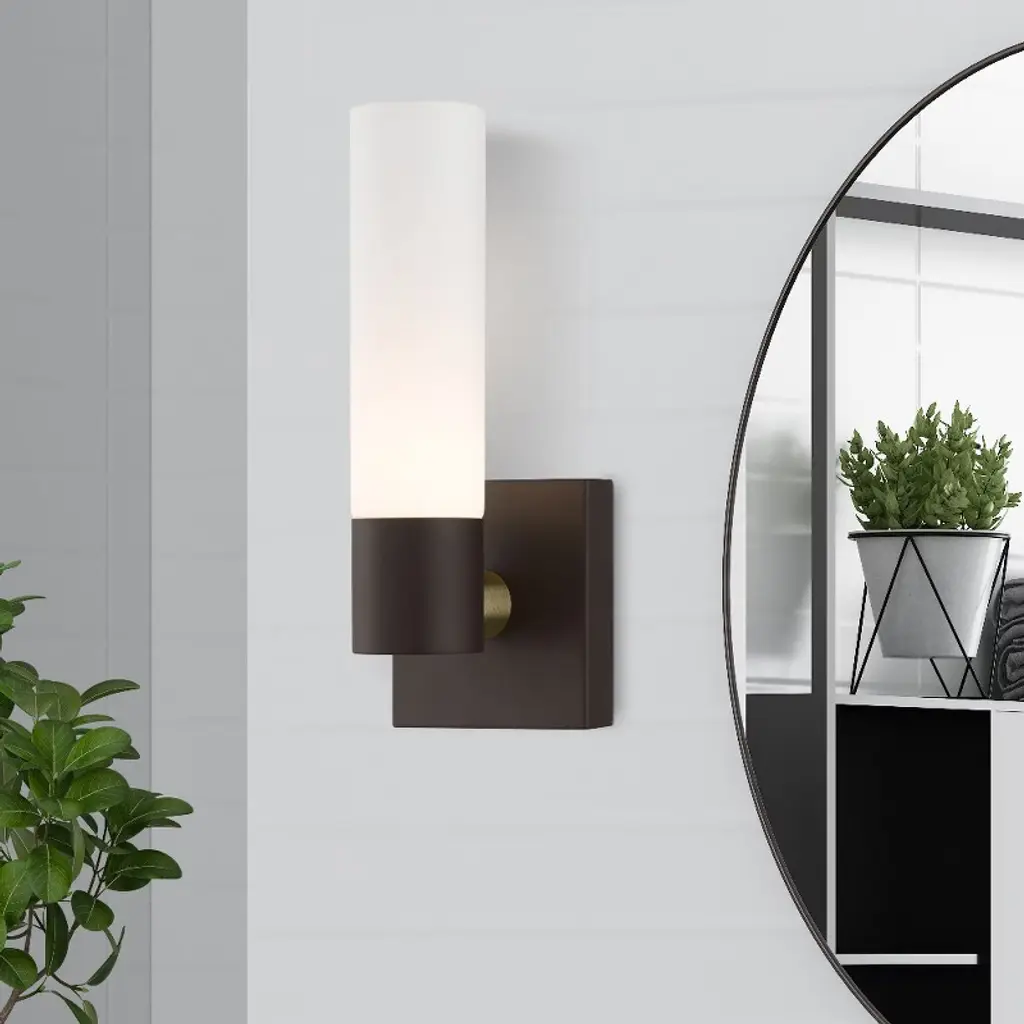 Collection: Aero, Material: Steel, Finish Color: Polished Brass, Width: 4.5", Height: 11.25", Depth: 3.9", Height From Outlet Box: 8.75", Backplate Width: 4.5", Lamping Type: Incandescent, Number Of Bulbs: 1, Wattage: 60 Watts, Moisture Rating: Dry Rated, Desc: With the sleek contemporary design, the Aero bath sconce casts a soft, flattering light as the tubular etched opal glass diffuses the light of one lamp. Mounting Direction: Up/Down / Back Plate Height: 0.75 / Back Plate Width: 4.50 / Shade Included: Yes / Shade Dimensions: 2.38 x 7.88. ,