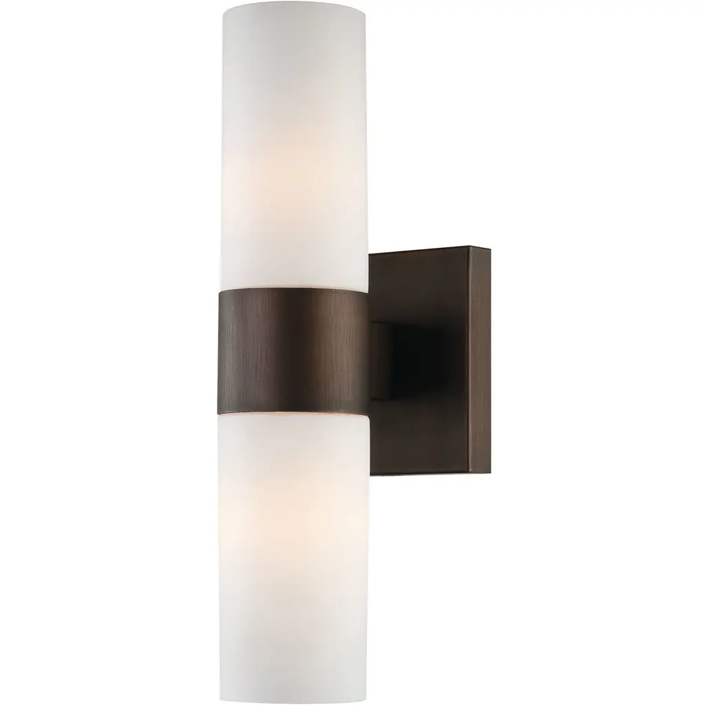Collection: Aero, Material: Steel, Finish Color: Bronze, Width: 19.25", Height: 4.25", Depth: 4", Height From Outlet Box: 9.63", Backplate Width: 4.25", Backplate Length: 0.63", Lamping Type: Incandescent, Number Of Bulbs: 2, Wattage: 60 Watts, Moisture Rating: Dry Rated, Desc: Add a dash of character and radiance to your home with this vanity sconce. This two-light fixture from the Aero Collection features an antique brass finish with two satin opal white glass cylinder shades on either side. The clean lines of the back plate complement the cylindrical glass shades creating a minimal, sleek, urban look that works well in most decors. This fixture adds upscale charm and contemporary aesthetics to your home. Mounting Direction: Up or Down / Shade Included: Yes. ,