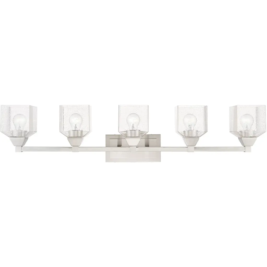 Collection: Aragon, Material: Steel, Finish Color: Brushed Nickel, Width: 23", Height: 9.5", Depth: 6.75", Height From Outlet Box: 7", Backplate Width: 4.75", Backplate Length: 0.75", Lamping Type: Incandescent, Number Of Bulbs: 3, Wattage: 100 Watts, Moisture Rating: Dry Rated, Desc: This bath vanity light is sure to provide reliable illumination without sacrificing style. It features three clear seeded glass shades with an open bottom, exposing the bulbs inside. A black finish covers the backplate and accents the light.,