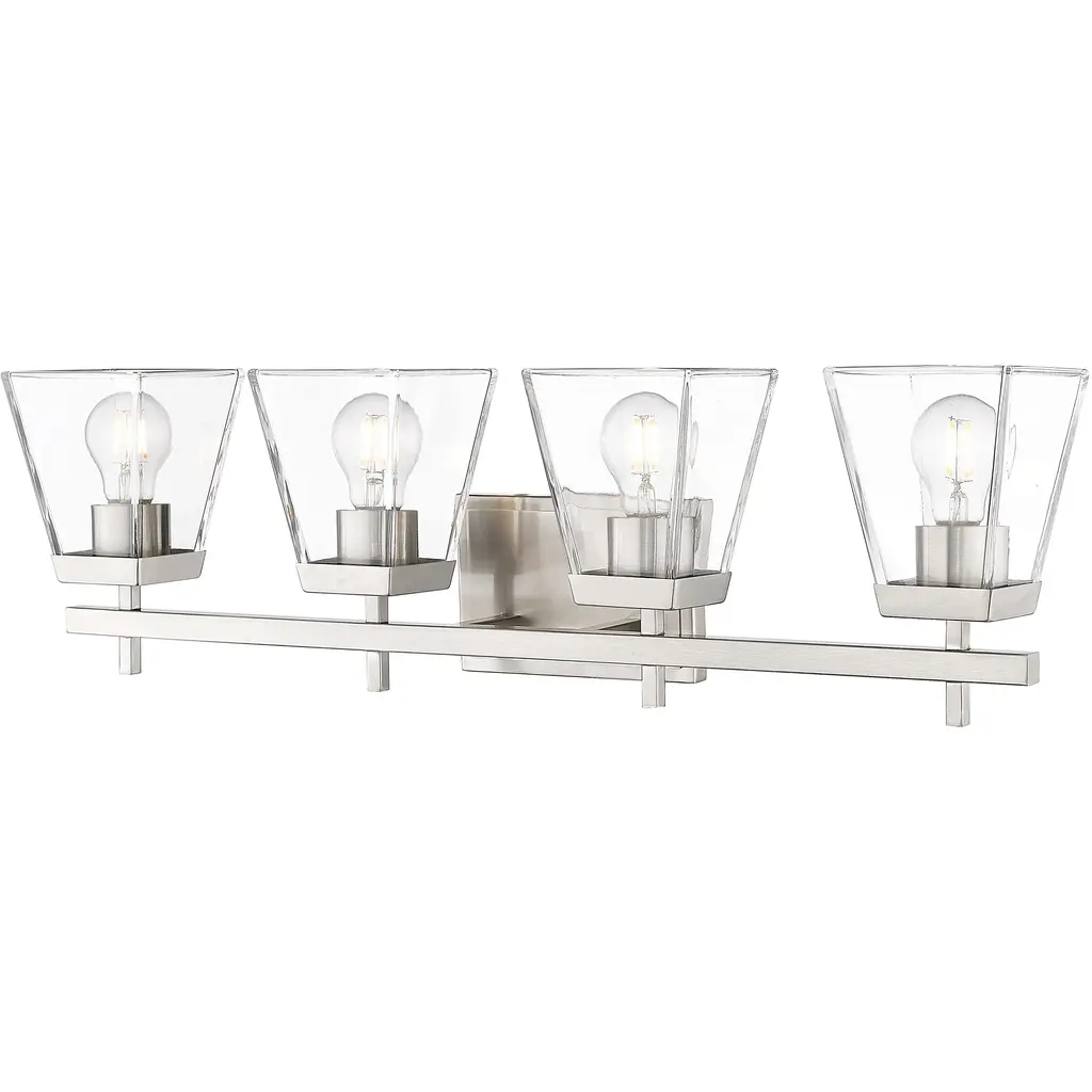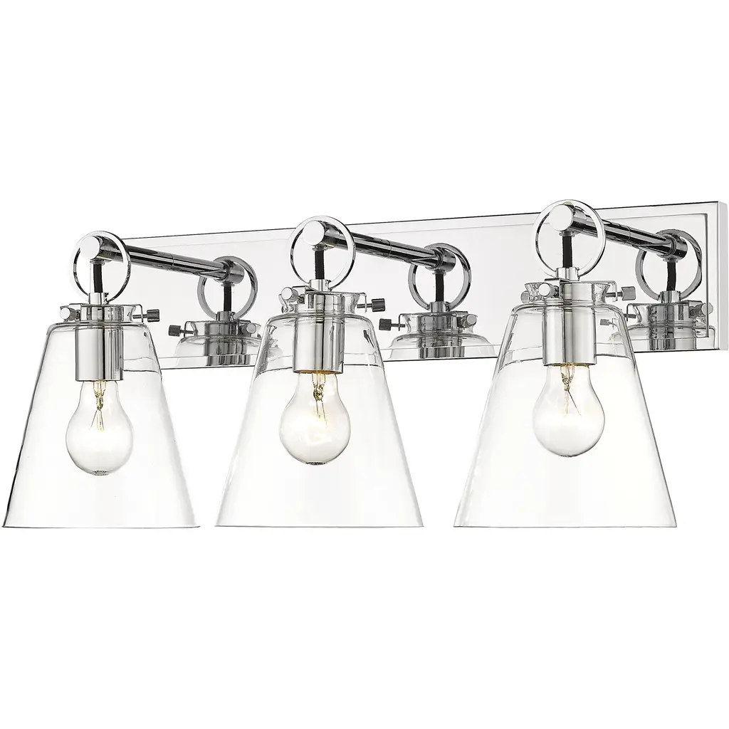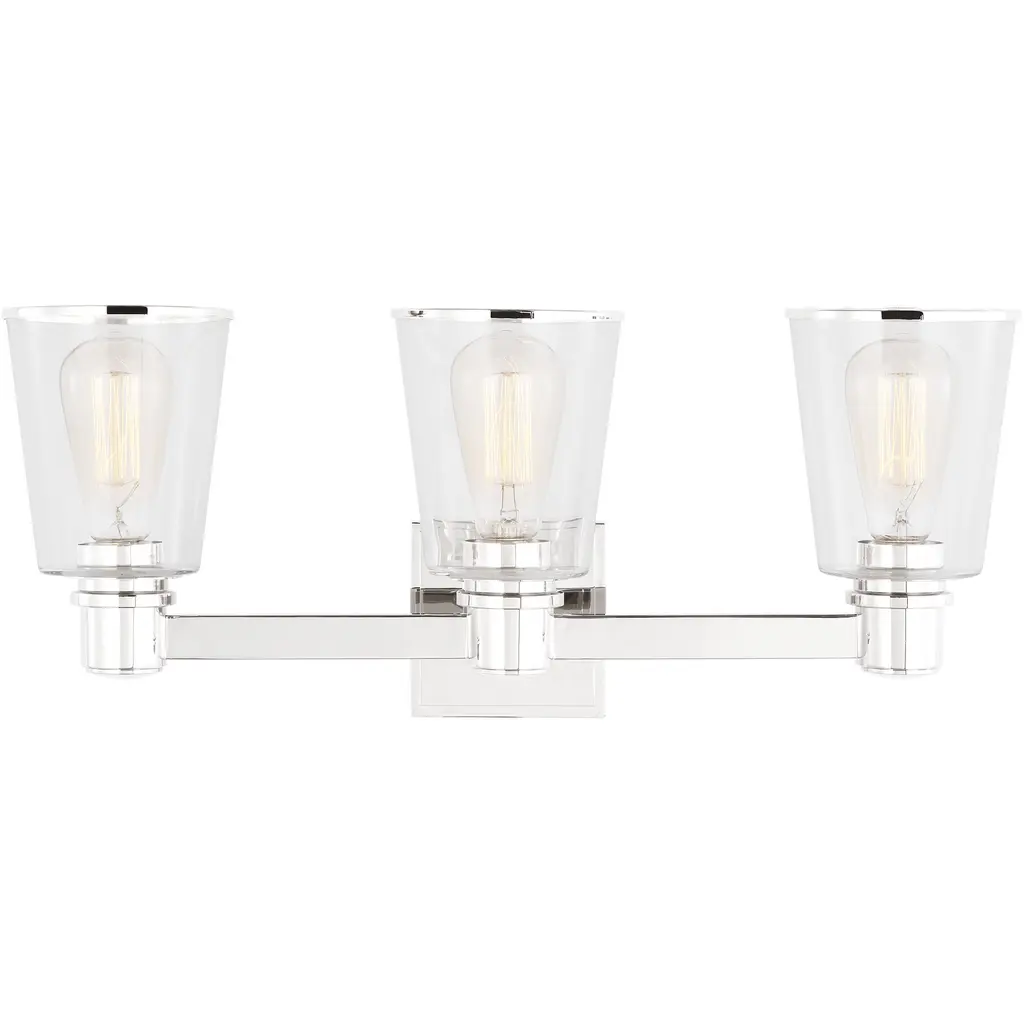 Collection: Birmingham, Material: Steel, Finish Color: Polished Chrome, Width: 24", Height: 7", Depth: 7", Height From Outlet Box: 4.25", Backplate Width: 24", Backplate Length: 4.5", Lamping Type: Incandescent, Number Of Bulbs: 3, Wattage: 100 Watts, Moisture Rating: Dry Rated, Desc: Bring a beautiful new look to your bathroom or vanity area with this charming three-light vanity sconce from the Birmingham collection. A wide rectangular antique brass finish back plate supports three simple graceful arms that hold three hand blown clear glass shades. The clean lines of this updated classic will make this piece an appealing part of your home. Mounting Direction: Up or Down / Shade Included: Yes. ,