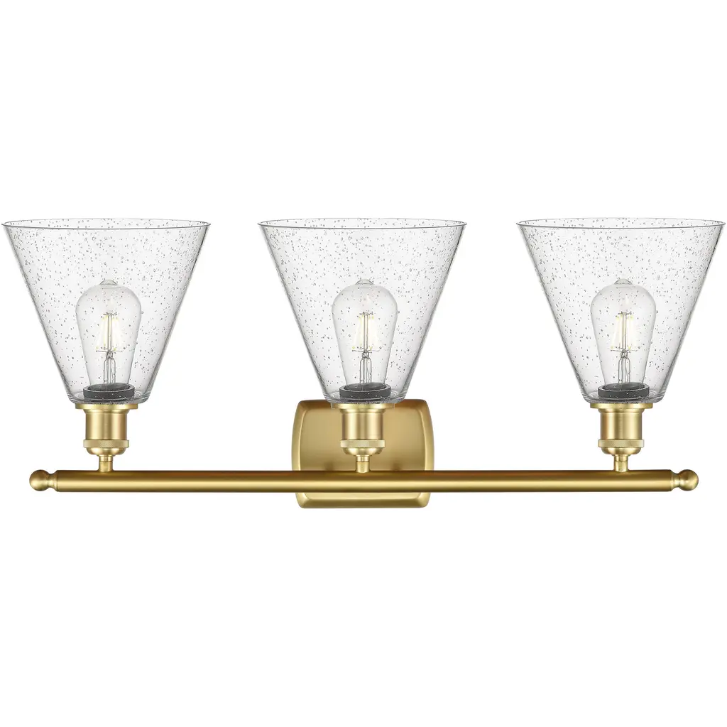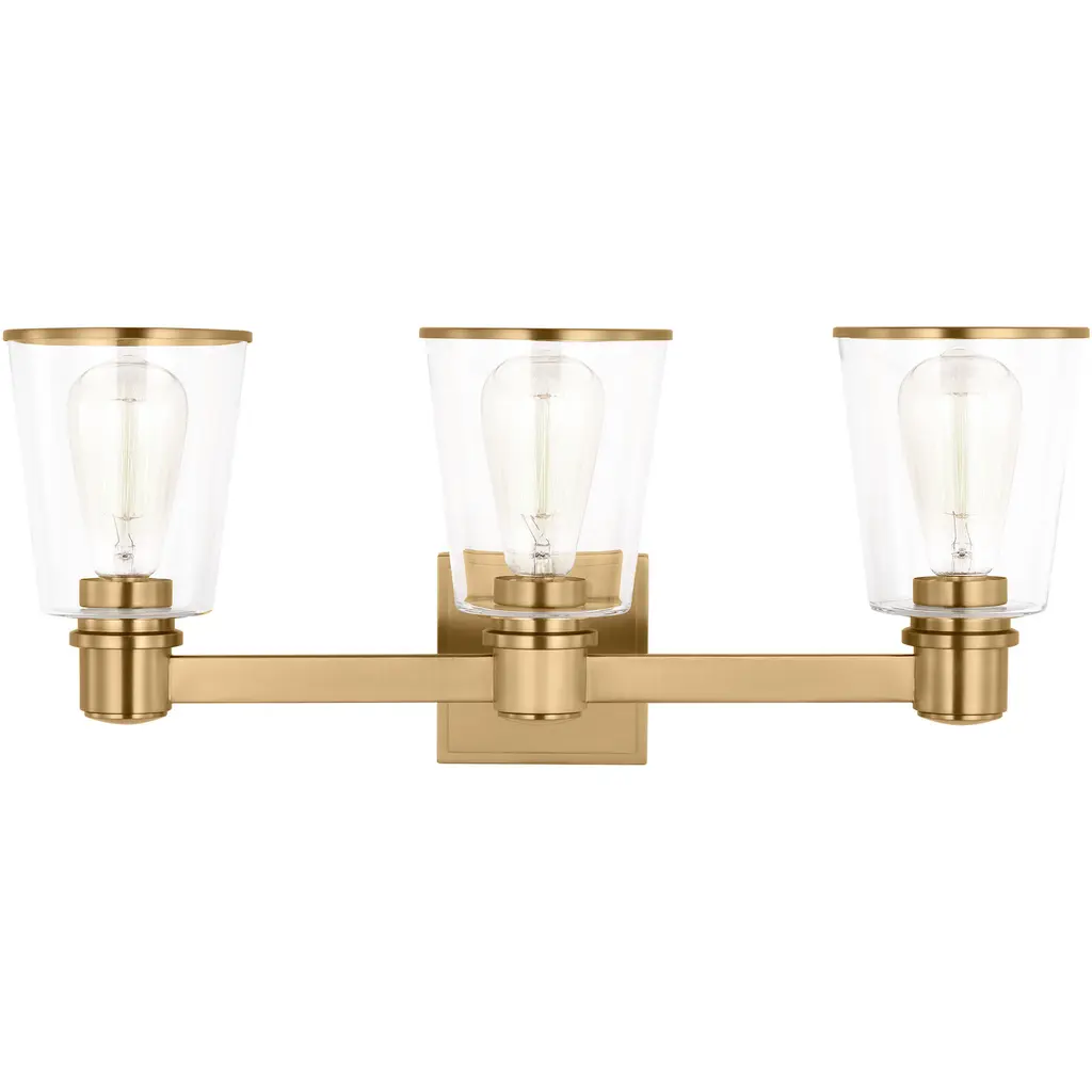 Collection: Catania, Material: Steel, Finish Color: Polished Brass, Width: 23", Height: 9.25", Depth: 6.25", Height From Outlet Box: 6.88", Backplate Width: 4.75", Backplate Length: 0.75", Lamping Type: Incandescent, Number Of Bulbs: 3, Wattage: 60 Watts, Moisture Rating: Dry Rated, Desc: The clean and simple Catania vanity sconce features a polished brass finish with hand blown clear glass. This sleek design will brighten up any bathroom.,