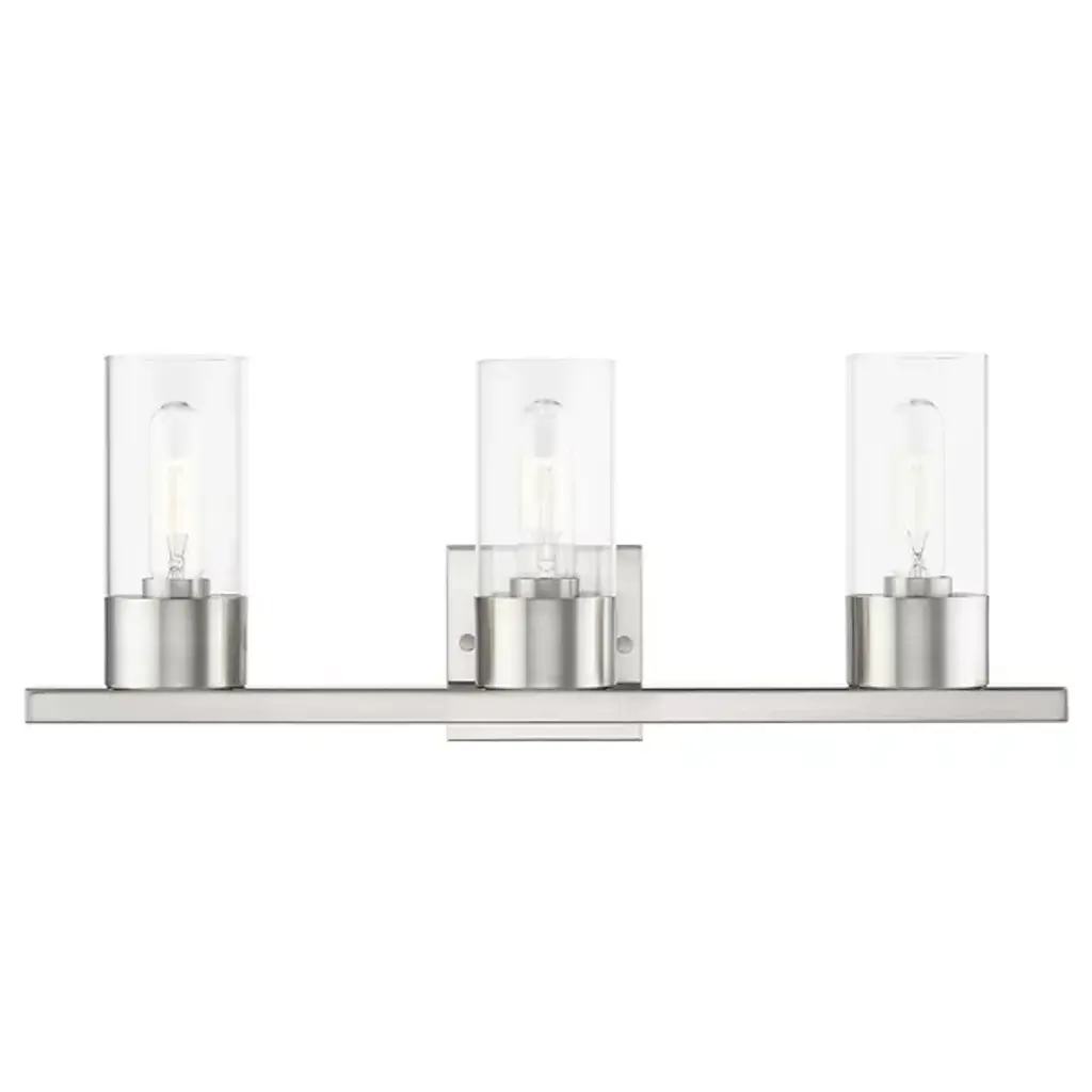 Collection: Cityview, Material: Steel, Finish Color: Brushed Nickel, Width: 22.5", Height: 8", Depth: 5", Height From Outlet Box: 5.63", Backplate Width: 4.75", Backplate Length: 0.75", Lamping Type: Incandescent, Number Of Bulbs: 3, Wattage: 60 Watts, Moisture Rating: Dry Rated, Desc: Brighten up your bathroom vanity with the sleek look of the Cityview three light vanity sconce. The tapered clear glass shades and the black finish make a perfect match.,