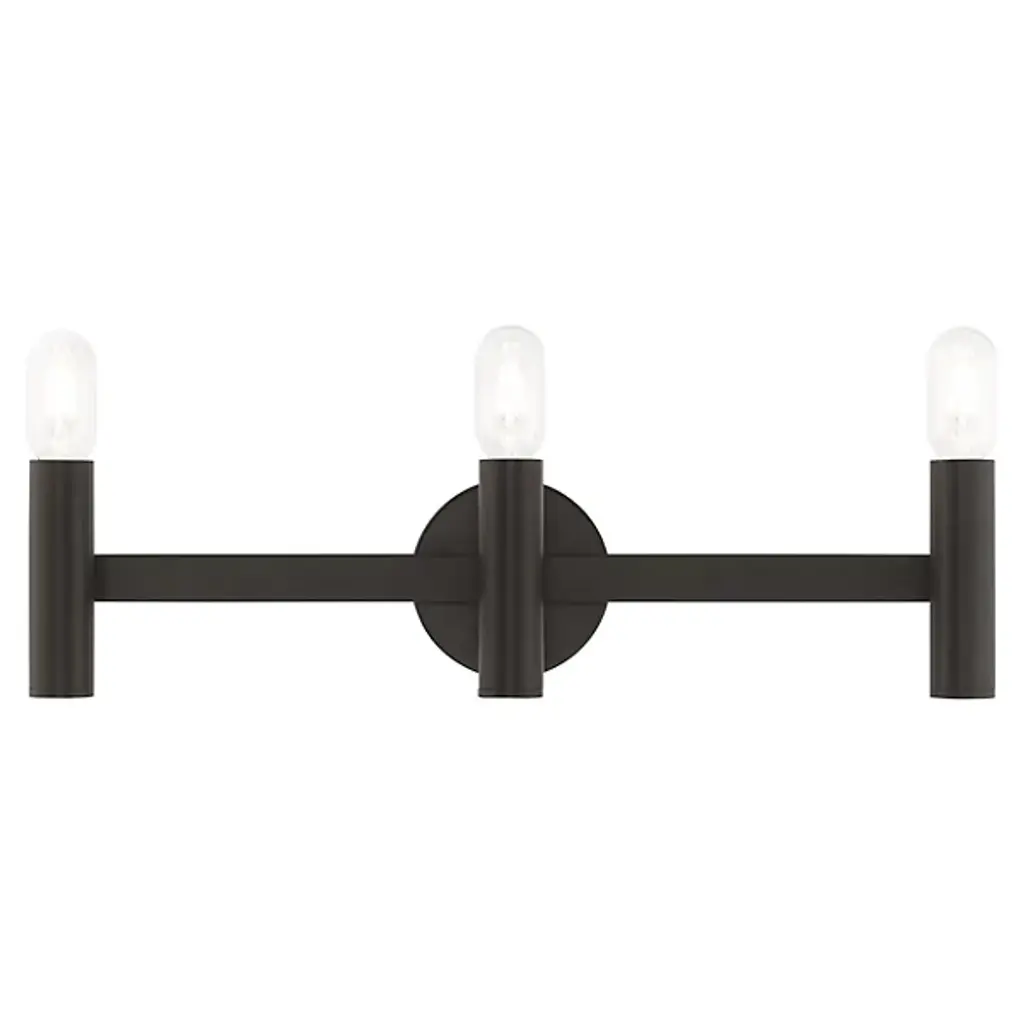 Collection: Copenhagen, Material: Steel, Finish Color: Brushed Nickel, Width: 23.5", Height: 9.25", Depth: 3.75", Height From Outlet Box: 6.5", Backplate Width: 5.13", Backplate Length: 0.75", Lamping Type: Incandescent, Number Of Bulbs: 3, Wattage: 60 Watts, Moisture Rating: Dry Rated, Desc: Exposed bulb sockets are fixed over polished chrome to create an eclectic look perfect for mid century modern or transitional spaces wanting an industrial touch. Mounting Direction: Up/Down. ,
