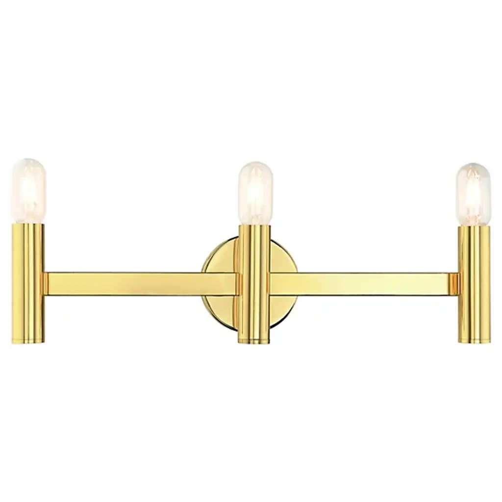 Collection: Copenhagen, Material: Steel, Finish Color: Satin Brass, Width: 23.5", Height: 10.75", Depth: 4", Height From Outlet Box: 7", Backplate Width: 5.13", Backplate Length: 0.75", Lamping Type: Incandescent, Number Of Bulbs: 4, Wattage: 60 Watts, Moisture Rating: Dry Rated, Desc: Clean lines and exposed bulb sockets make the Copenhagen collectionperfect for your mid-mod or transitiol bath. The eclectic look is perfect for spaces wanting an urban, minimalistic or industrial touch. With superb craftsmanship and affordable price, this black four-light vanity sconce is sure to tastefully indulge your extravagant side. Mounting Direction: Up or Down. ,
