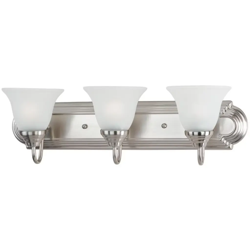 Collection: Coronado, Material: Steel, Finish Color: Polished Chrome, Width: 26.5", Height: 8.5", Depth: 9.25", Height From Outlet Box: 3.5", Backplate Width: 8", Backplate Length: 4.5", Lamping Type: Incandescent, Number Of Bulbs: 3, Wattage: 100 Watts, Moisture Rating: Dry Rated, Desc: Classic polished chrome three light fixture paired with white alabaster glass. Timeless in its vintage appeal, this light is stylish for both new and restored homes. Mounting Direction: Up/Down / Shade Included: Yes. ,