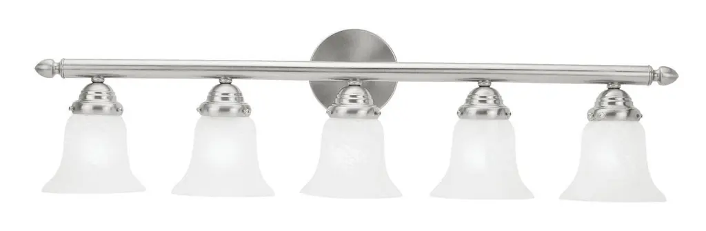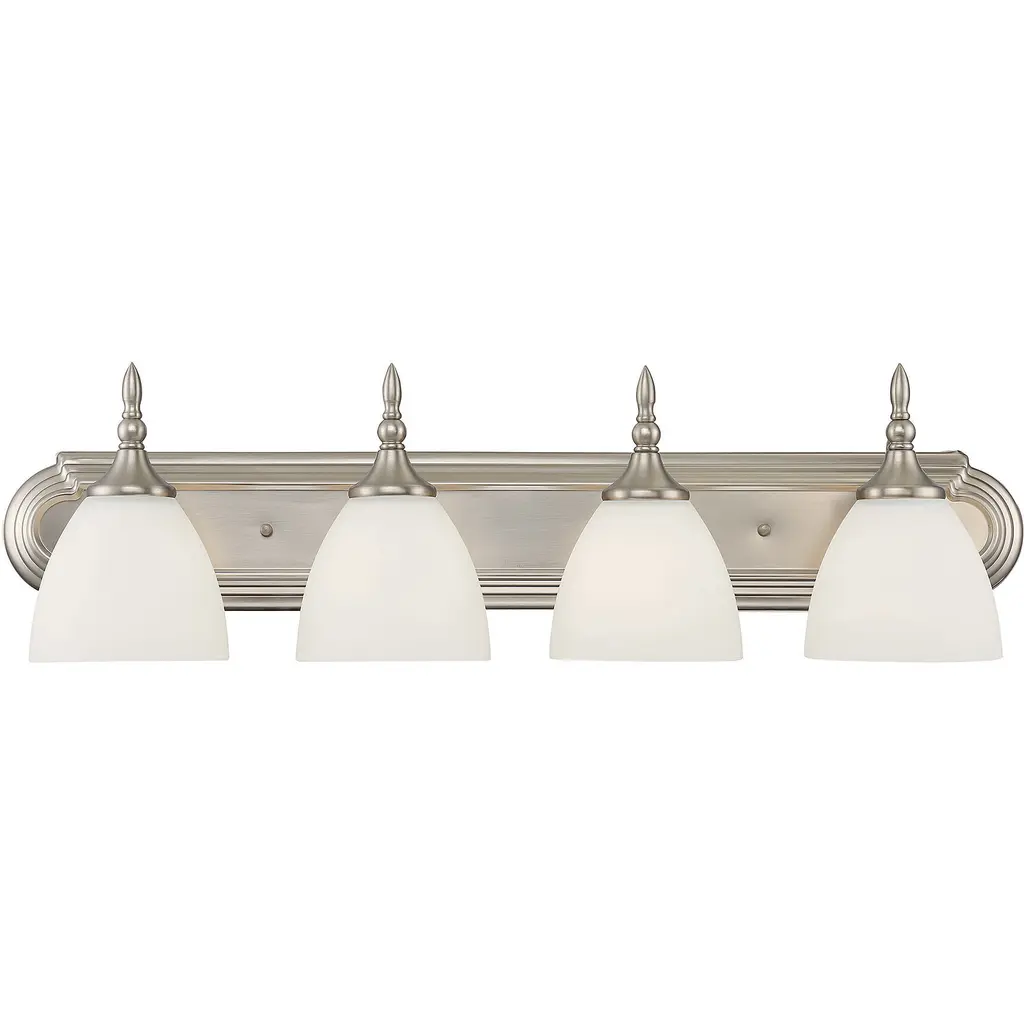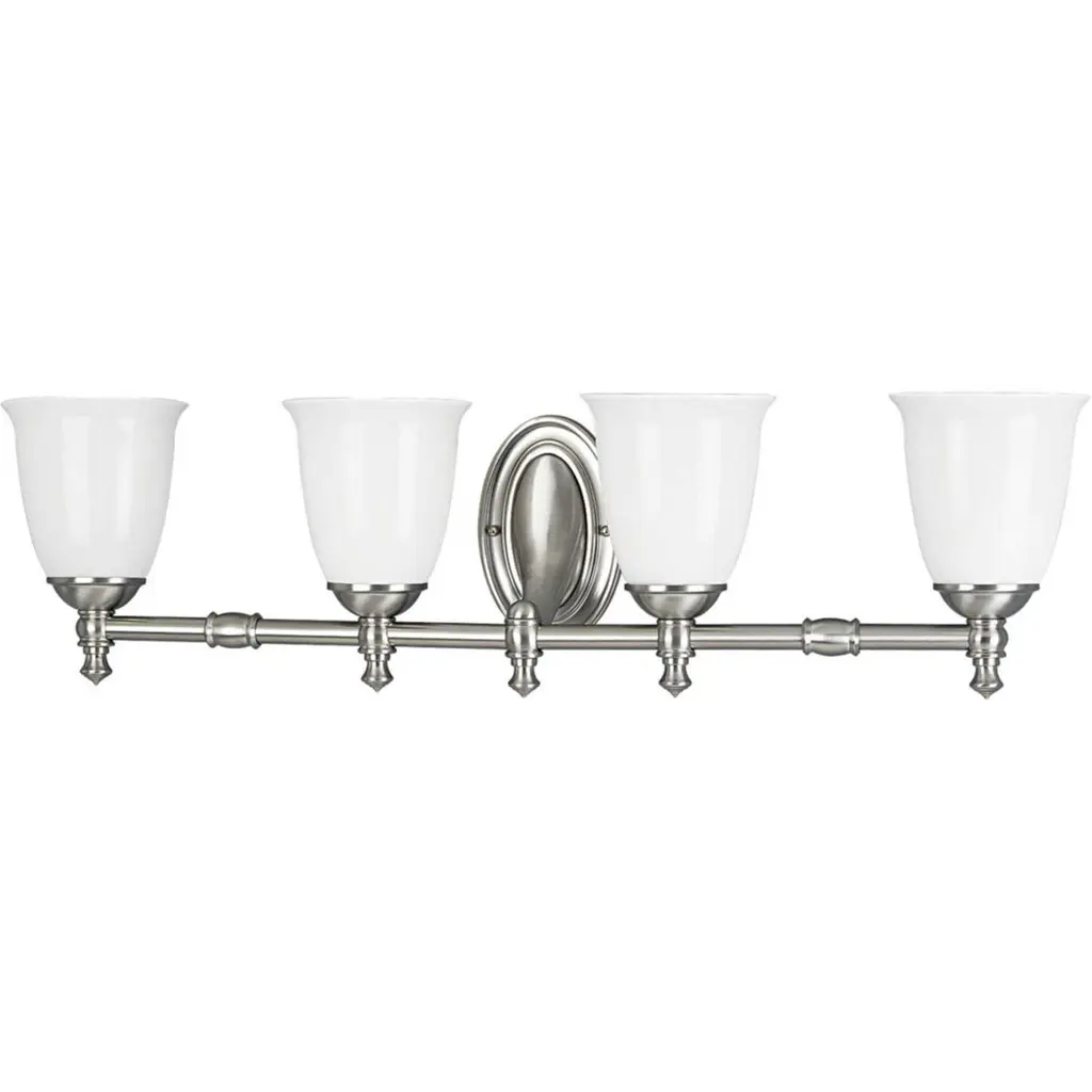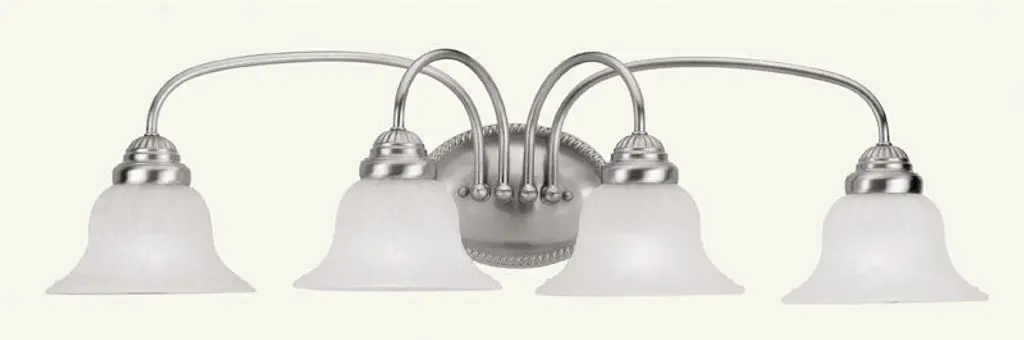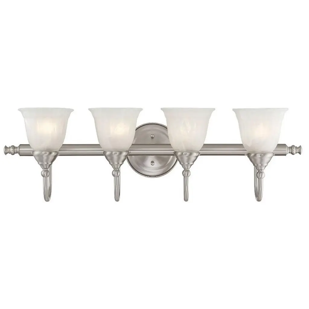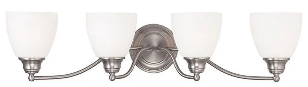 Collection: Edgemont, Material: Steel, Finish Color: Brushed Nickel, Width: 30.5", Height: 8", Depth: 8.75", Height From Outlet Box: 4.25", Backplate Width: 7", Backplate Length: 5", Lamping Type: Incandescent, Number Of Bulbs: 4, Wattage: 100 Watts, Moisture Rating: Damp Rated, Desc: This four light bath vanity from the Edgemont collection is a fine and handsome fixture that features white alabaster glass. Edgemont is comprised of traditional iron forms in an antique brass finish. Mounting Direction: Up/Down / Shade Included: Yes. ,