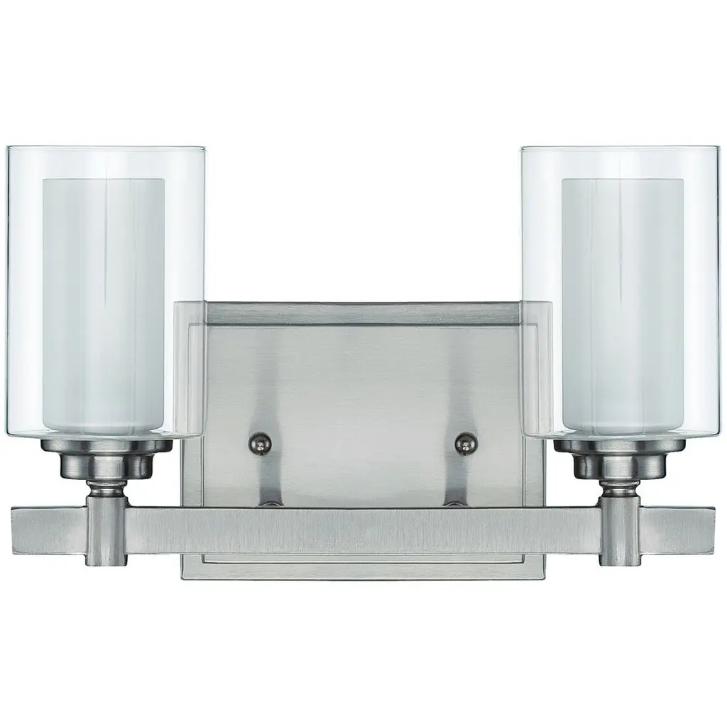 Collection: Hillcrest, Material: Steel, Finish Color: Brushed Nickel, Width: 12.75", Height: 10.63", Depth: 4.75", Height From Outlet Box: 8.13", Backplate Width: 5.13", Lamping Type: Incandescent, Number Of Bulbs: 2, Wattage: 100 Watts, Moisture Rating: Dry Rated, Desc: The two light bath vanity from the Hillcrest collection features a simple elegant polished chrome frame paired with clear glass shades. Each shade is accented with a banded polished chrome ring to carry through the theme of finely crafted metal fittings. Mounting Direction: Up/Down / Shade Included: Yes. ,