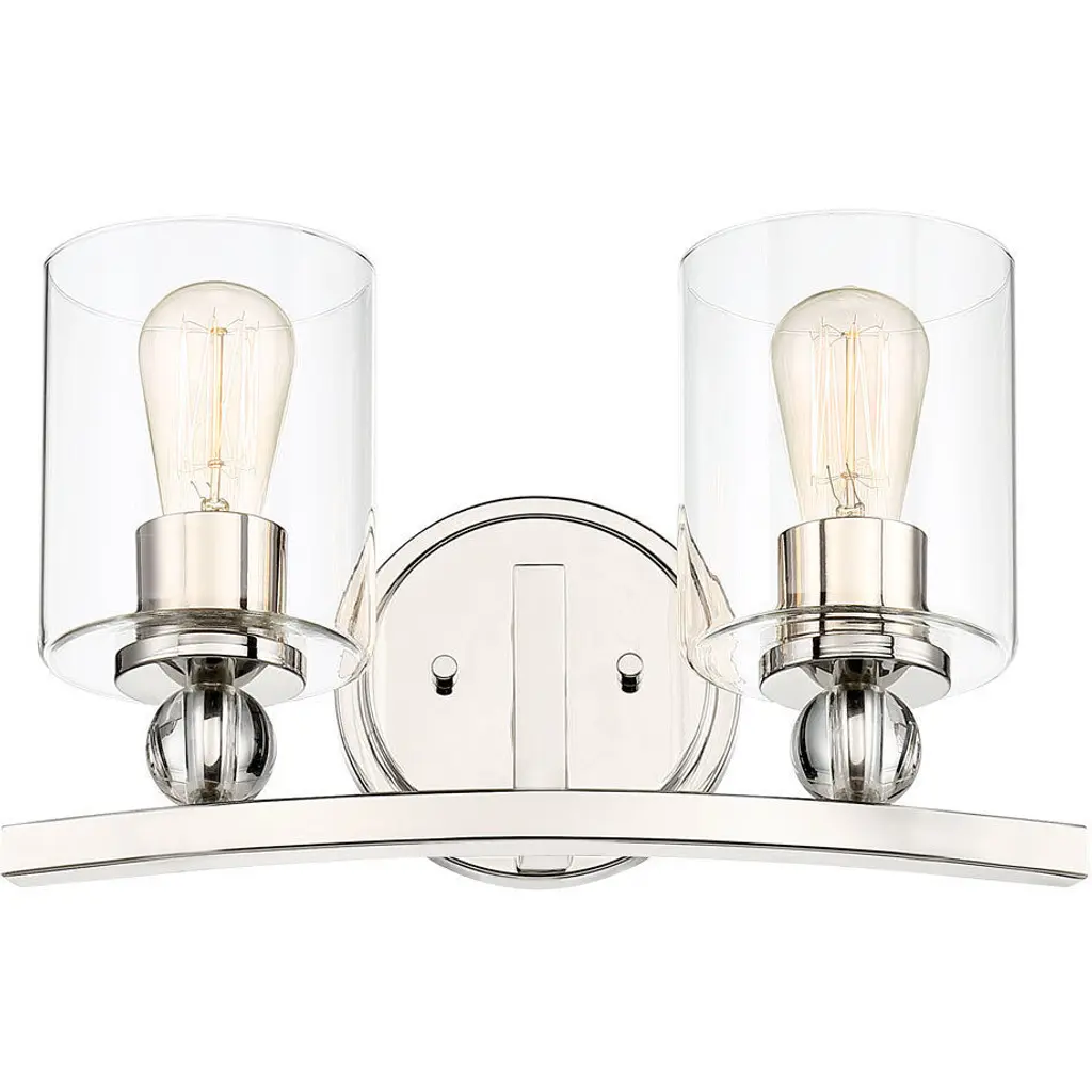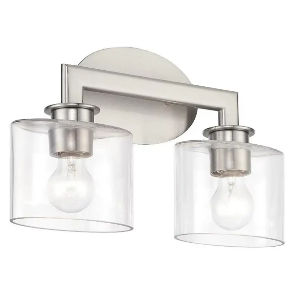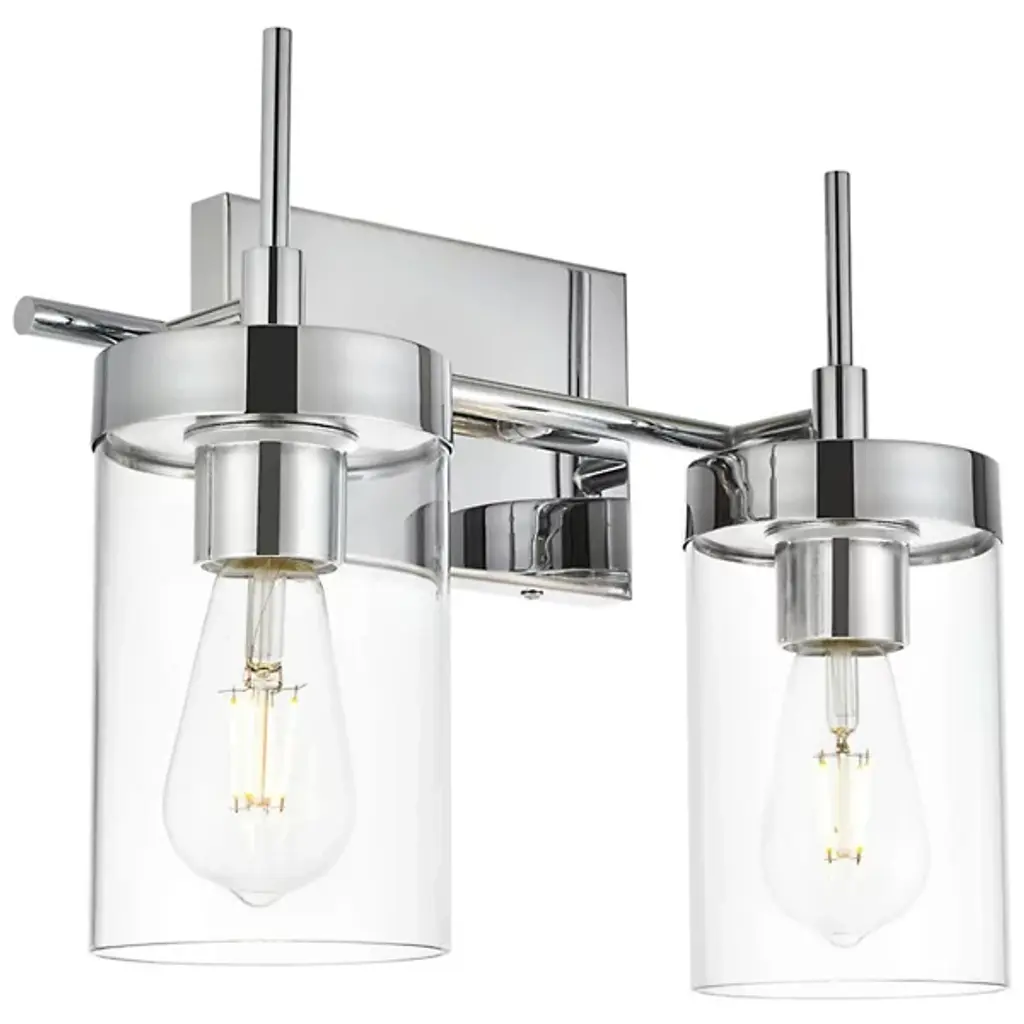 Collection: Hillcrest, Material: Steel, Finish Color: Polished Chrome, Width: 12.75", Height: 10.63", Depth: 4.75", Height From Outlet Box: 8.13", Backplate Width: 5.13", Lamping Type: Incandescent, Number Of Bulbs: 2, Wattage: 100 Watts, Moisture Rating: Dry Rated, Desc: The two light bath vanity from the Hillcrest collection features a simple elegant polished chrome frame paired with clear glass shades. Each shade is accented with a banded polished chrome ring to carry through the theme of finely crafted metal fittings. Mounting Direction: Up/Down / Shade Included: Yes. ,