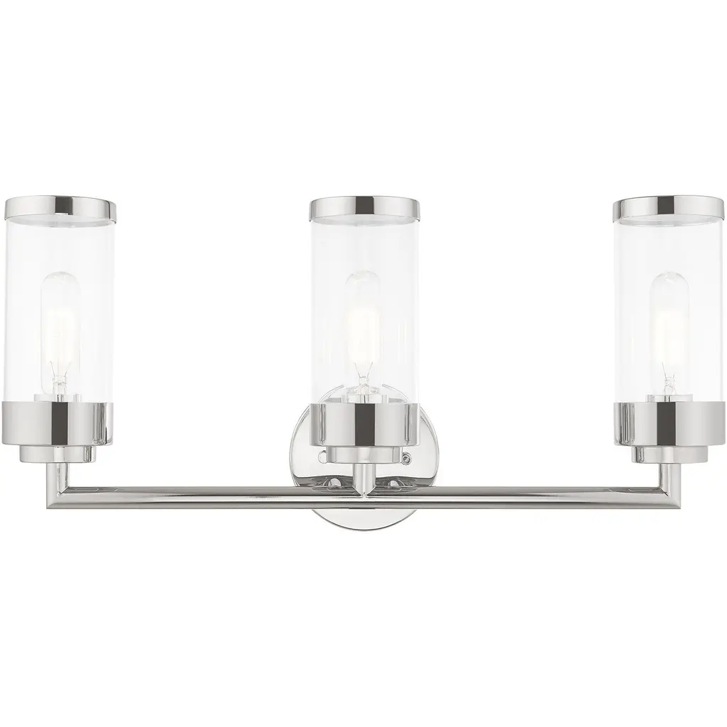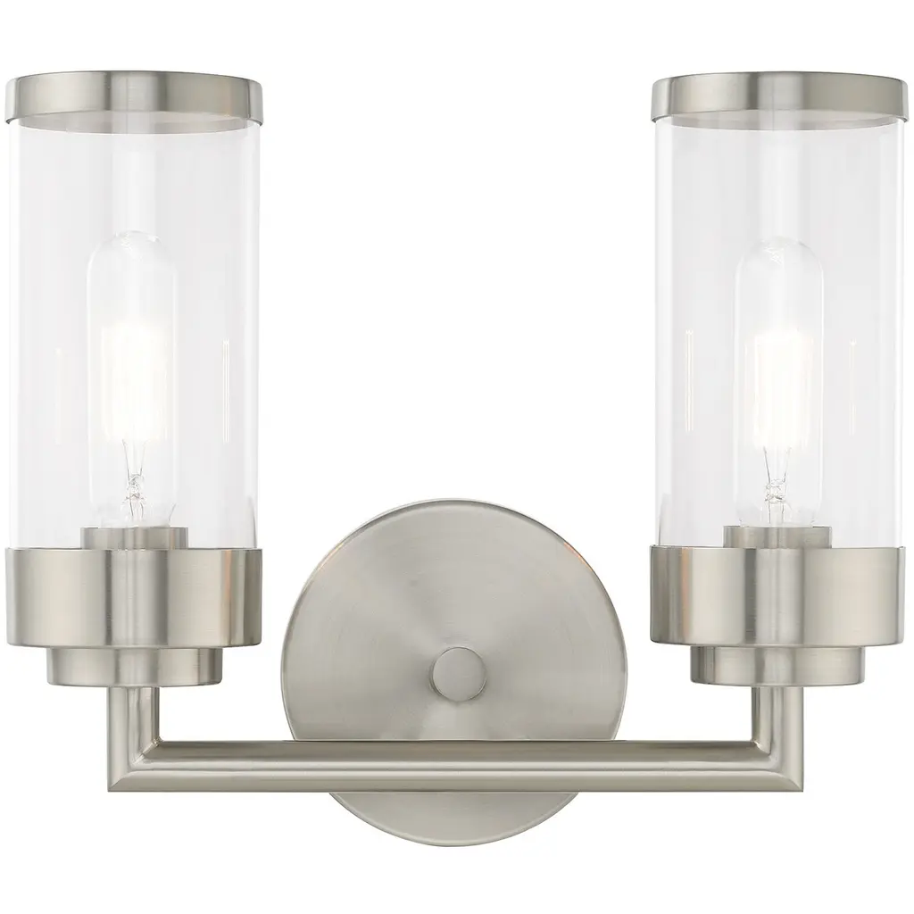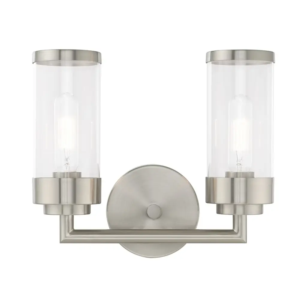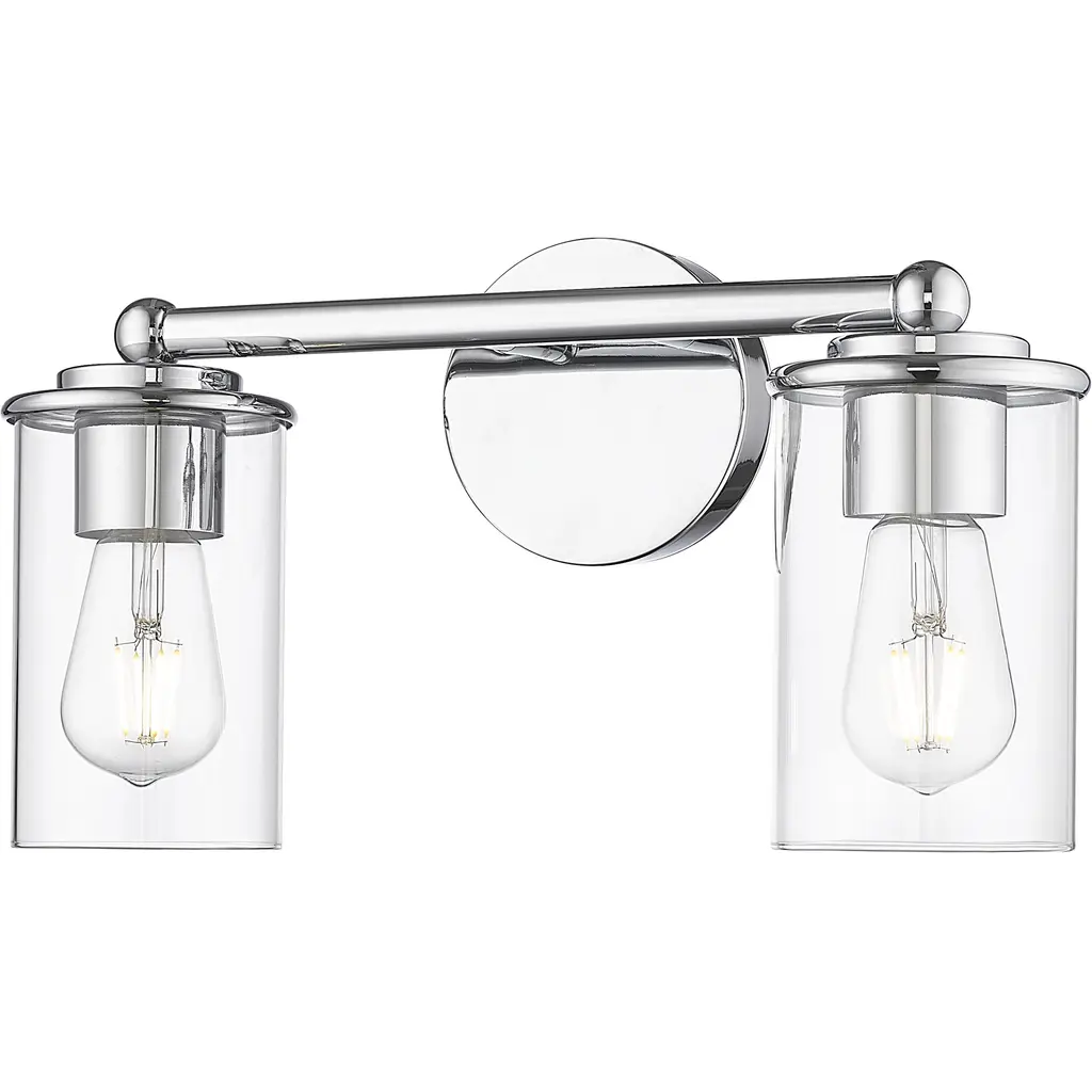 Collection: Hillcrest, Material: Steel, Finish Color: Polished Chrome, Width: 12.75", Height: 10.63", Depth: 4.75", Height From Outlet Box: 8.13", Backplate Width: 5.13", Lamping Type: Incandescent, Number Of Bulbs: 2, Wattage: 100 Watts, Moisture Rating: Dry Rated, Desc: The two light bath vanity from the Hillcrest collection features a simple elegant polished chrome frame paired with clear glass shades. Each shade is accented with a banded polished chrome ring to carry through the theme of finely crafted metal fittings. Mounting Direction: Up/Down / Shade Included: Yes. ,