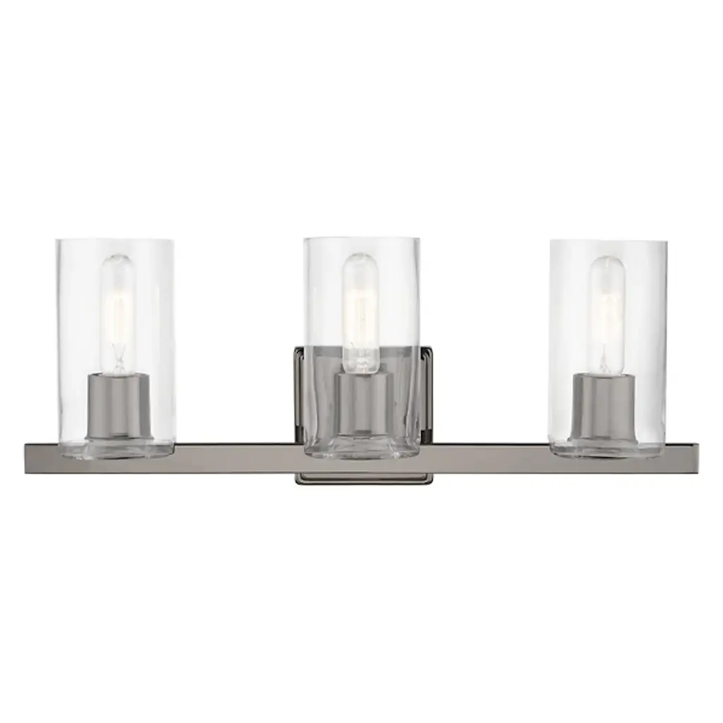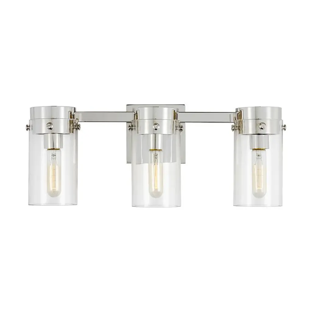 Collection: Hillcrest, Material: Steel, Finish Color: Polished Chrome, Width: 23.5", Height: 10.63", Depth: 4.75", Height From Outlet Box: 8.13", Backplate Width: 5.13", Lamping Type: Incandescent, Number Of Bulbs: 3, Wattage: 100 Watts, Moisture Rating: Dry Rated, Desc: The three light bath vanity from the Hillcrest collection features a simple elegant polished chrome frame paired with clear glass shades. Each shade is accented with a banded polished chrome ring to carry through the theme of finely crafted metal fittings. Mounting Direction: Up/Down / Shade Included: Yes. ,