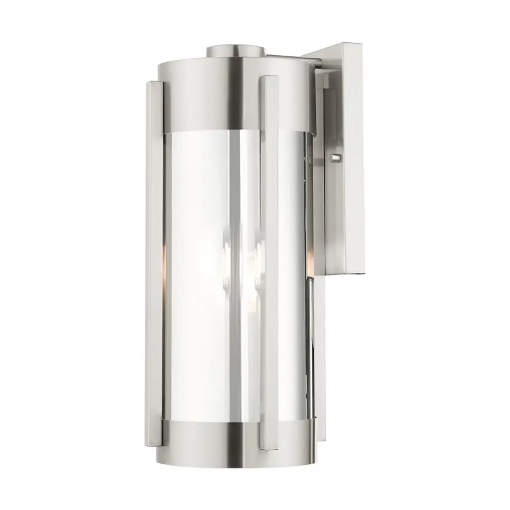 Collection: Hillcrest, Material: Steel, Finish Color: Polished Chrome, Width: 6.5", Height: 20.5", Depth: 8", Height From Outlet Box: 10.25", Backplate Width: 6.5", Backplate Length: 20.5", Lamping Type: Incandescent, Number Of Bulbs: 3, Wattage: 40 Watts, Moisture Rating: Dry Rated, Desc: The three light outdoor wall lantern from the Hillcrest collection made of rugged stainless steel features a simple elegant polished chrome frame paired with closed top clear glass shade. The shade is accented with a banded polished chrome ring to carry through the theme of finely crafted metal fittings.�,