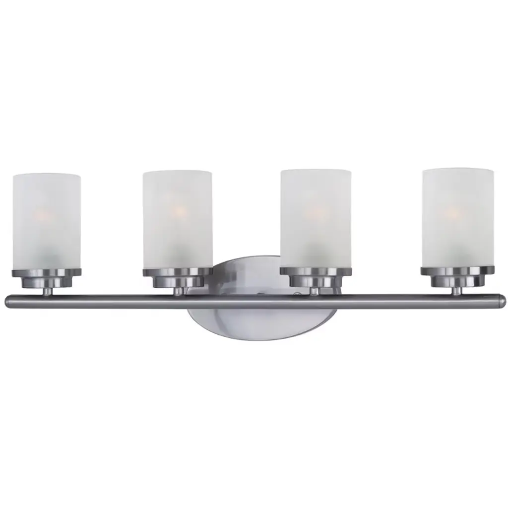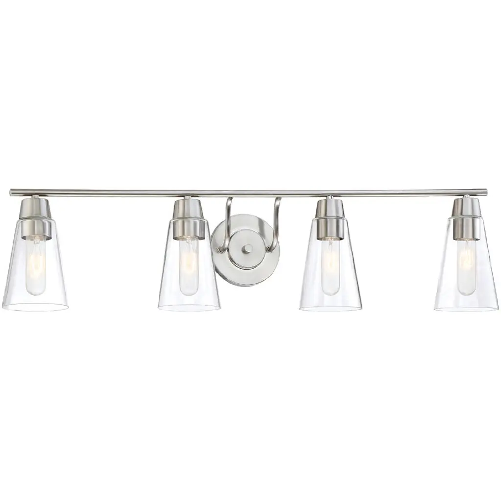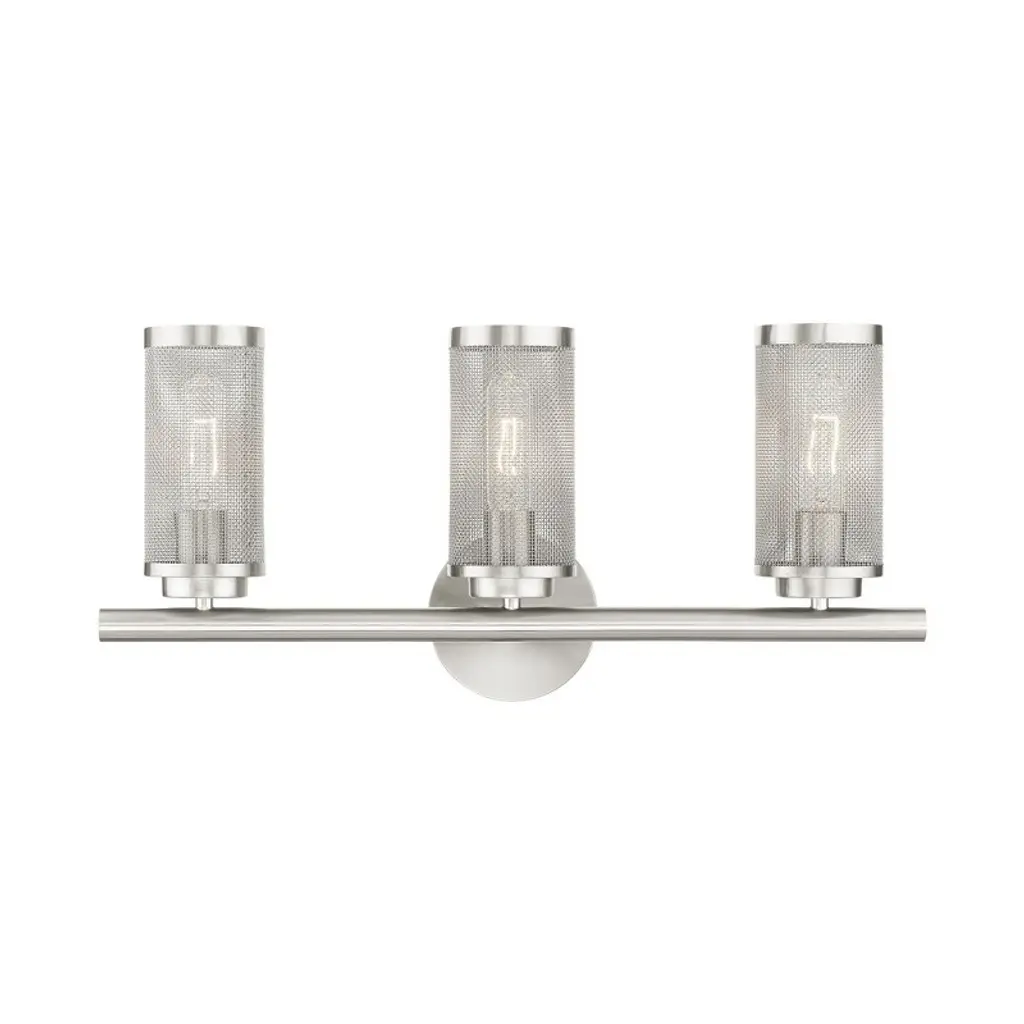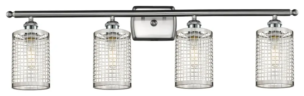 Collection: Industro, Material: Steel, Finish Color: Brushed Nickel, Width: 35.5", Height: 11", Depth: 5.5", Height From Outlet Box: 8.5", Backplate Width: 5.13", Backplate Length: 0.75", Lamping Type: Incandescent, Number Of Bulbs: 4, Wattage: 60 Watts, Moisture Rating: Dry Rated, Desc: The Industro collection has a clean, crisp look and contemporary appeal. This four-light vanity sconce has a black finish with brushed nickel finish accents and a sleek stainless steel mesh shade. This vanity sconce easily fits into industrial, transitional or modern classic bathrooms. Mounting Direction: Up/Down / Shade Included: Yes. ,