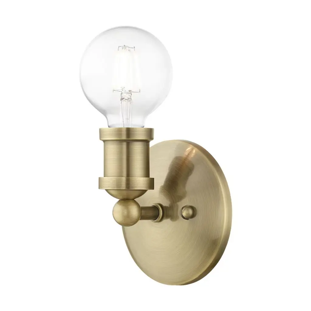 Collection: Lansdale, Material: Steel, Finish Color: Bronze/Antique Brass, Width: 5", Height: 5.25", Depth: 3.25", Height From Outlet Box: 2.63", Backplate Width: 5", Backplate Length: 1", Lamping Type: Incandescent, Number Of Bulbs: 1, Wattage: 60 Watts, Moisture Rating: Dry Rated, Desc: Simplicity and attention to detail are the key elements of the Lansdale collection. The dimensional form, exposed bulbs and combination of finishes adds a playful mood to a contemporary or urban interior. This single-light sconce design gives a new face to a bedroom, hallway or a bathroom vanity. It is shown in an antique brass finish.,