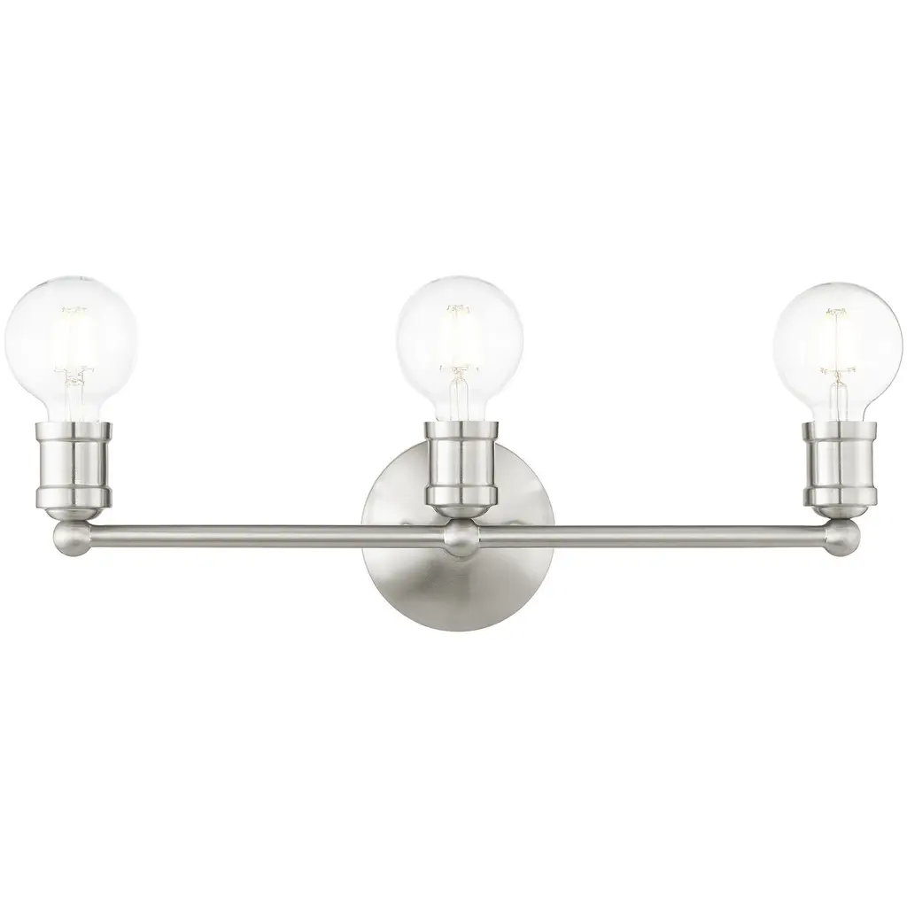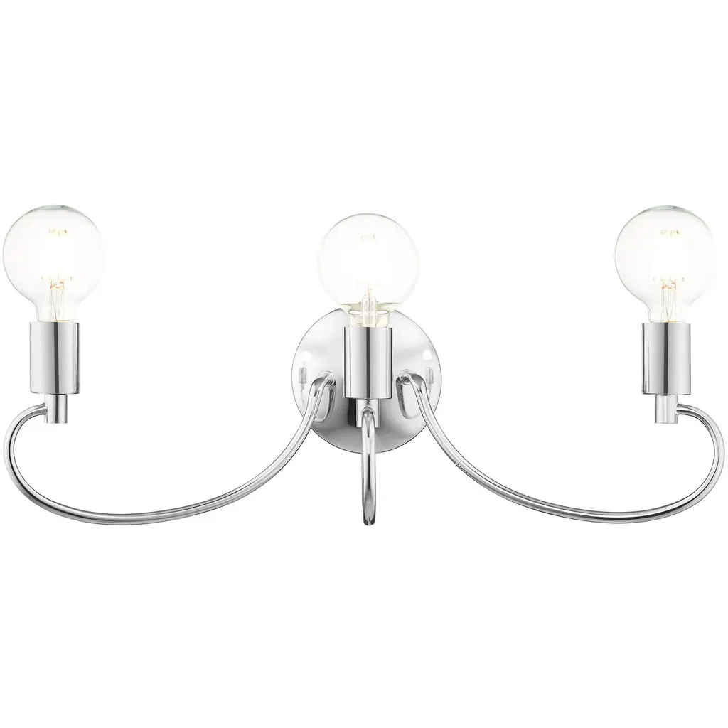 Collection: Lansdale, Material: Steel, Finish Color: Polished Chrome, Width: 20.25", Height: 5.13", Depth: 3.75", Height From Outlet Box: 7.75", Backplate Width: 5", Backplate Length: 1", Lamping Type: Incandescent, Number Of Bulbs: 3, Wattage: 60 Watts, Moisture Rating: Dry Rated, Desc: Clean lines and exposed bulb sockets make the Lansdale collectionperfect for your mid-mod or transitional bath. The eclectic look is perfect for spaces wanting an urban, minimalistic or industrial touch. With superb craftsmanship and affordable price, this polished brass three-light vanity sconce is sure to tastefully indulge your extravagant side. Mounting Direction: Up/Down. ,