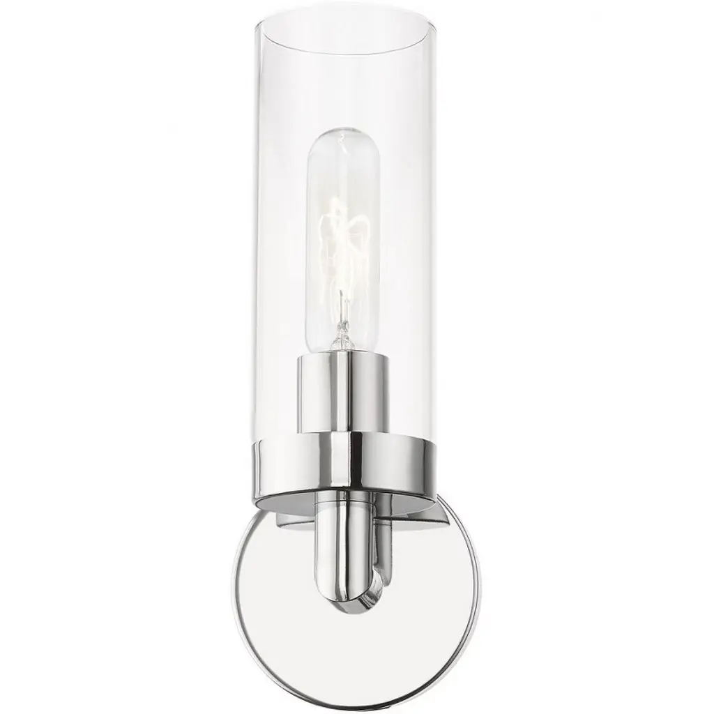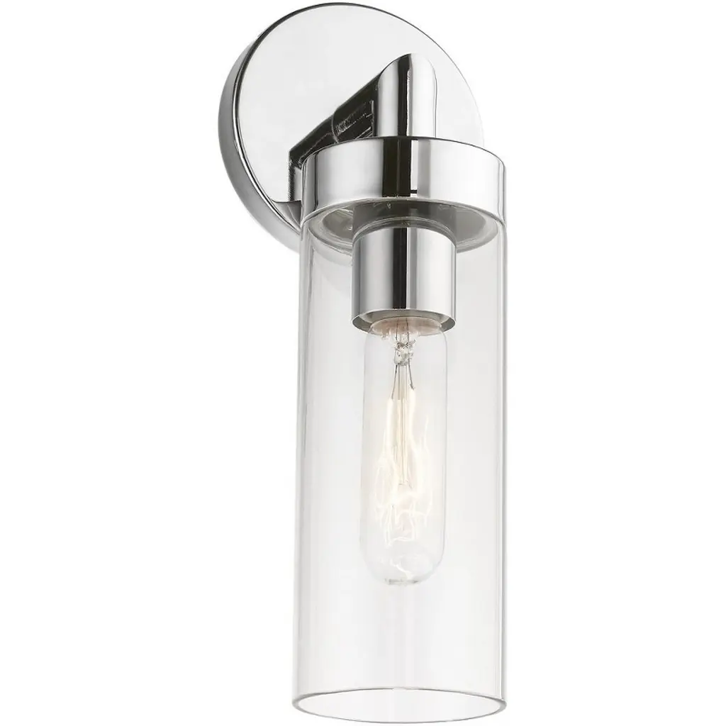 Collection: Ludlow, Material: Steel, Finish Color: Polished Chrome, Width: 4.25", Height: 11.75", Depth: 4", Height From Outlet Box: 9.63", Backplate Width: 4.25", Backplate Length: 0.63", Lamping Type: Incandescent, Number Of Bulbs: 1, Wattage: 60 Watts, Moisture Rating: Dry Rated, Desc: Add a dash of character and radiance to your home with this wall sconce. This single-light fixture from the Ludlow Collection features an antique brass finish with a clear glass. The clean lines of the back plate complement the cylindrical glass shade creating a minimal, sleek, urban look that works well in most decors. This fixture adds upscale charm and contemporary aesthetics to your home.,