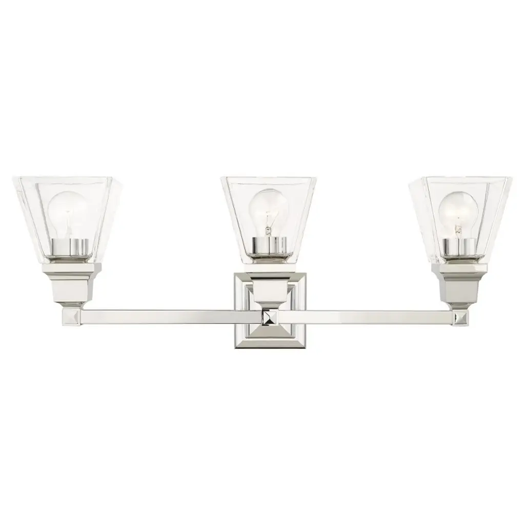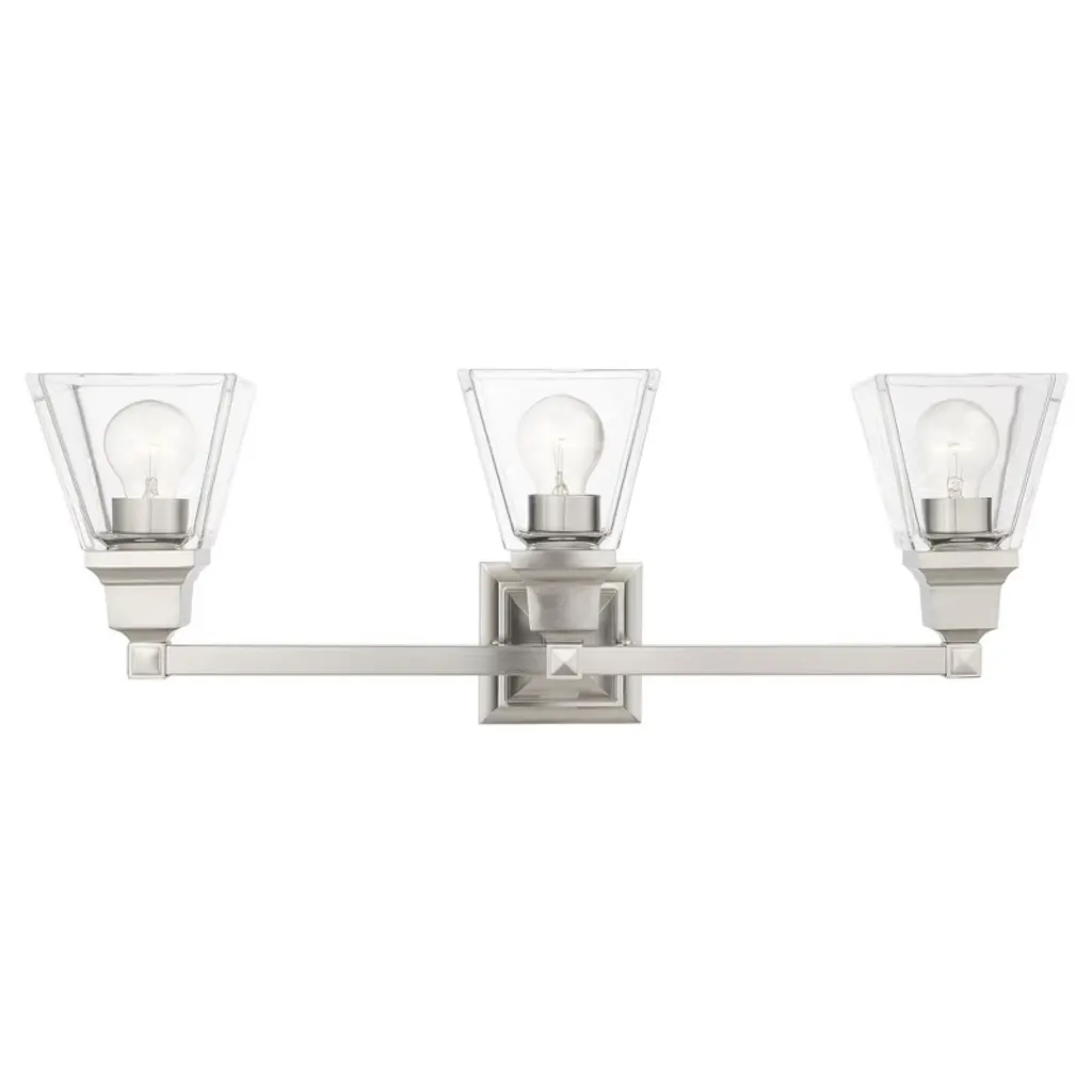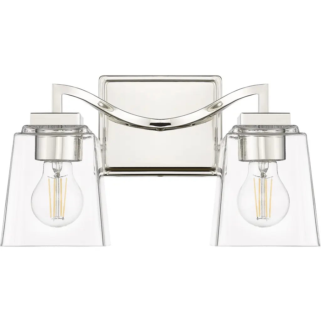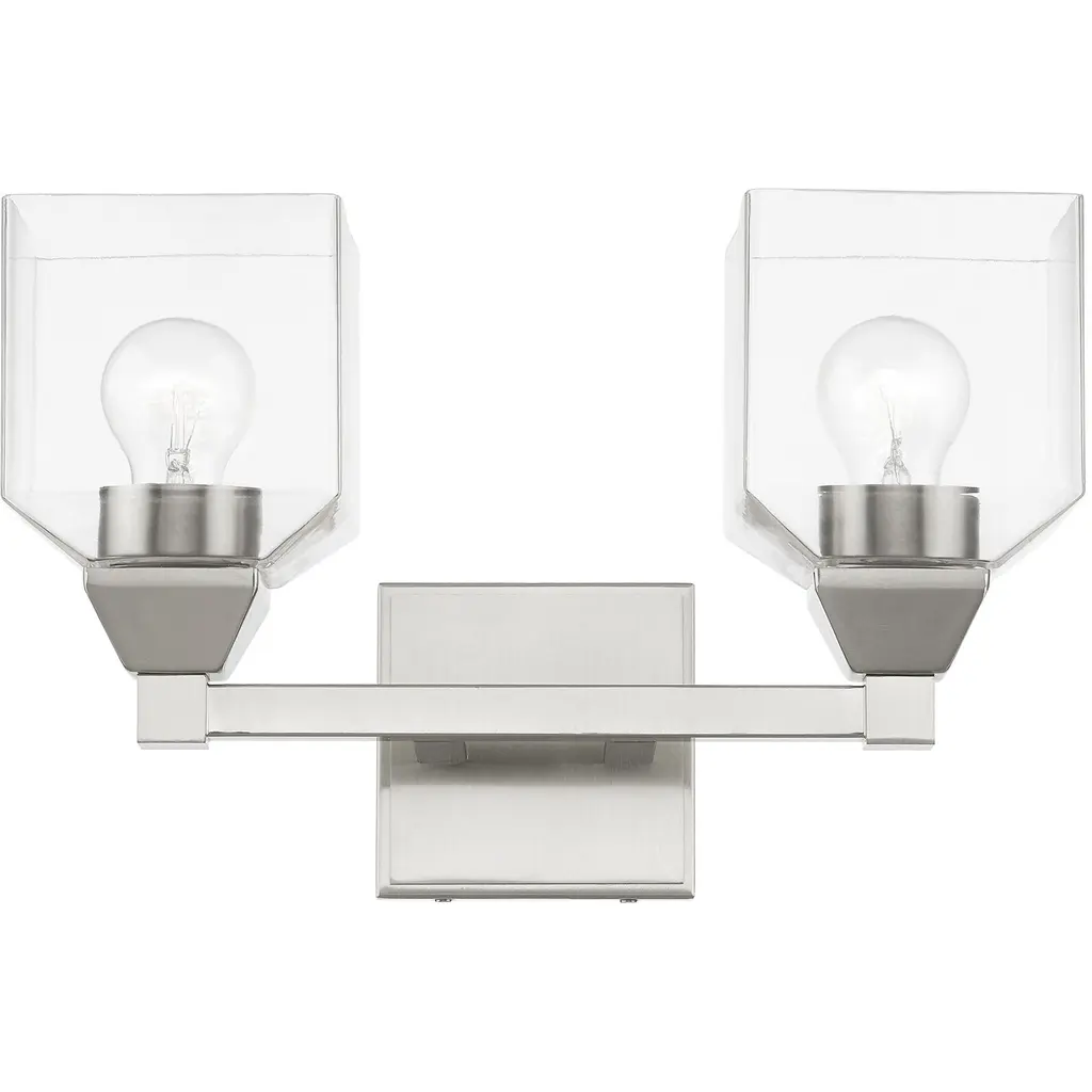 Collection: Mission, Material: Steel, Finish Color: Brushed Nickel, Width: 15", Height: 9.5", Depth: 7.75", Height From Outlet Box: 7.25", Backplate Width: 4.5", Backplate Length: 2.88", Lamping Type: Incandescent, Number Of Bulbs: 2, Wattage: 100 Watts, Moisture Rating: Dry Rated, Desc: The Mission collection has clean lines with geometric forms. This two light bath vanity light features clear glass on polished brass, square style arms that elevates the classic look. Mounting Direction: Up/Down / Shade Included: Yes. ,