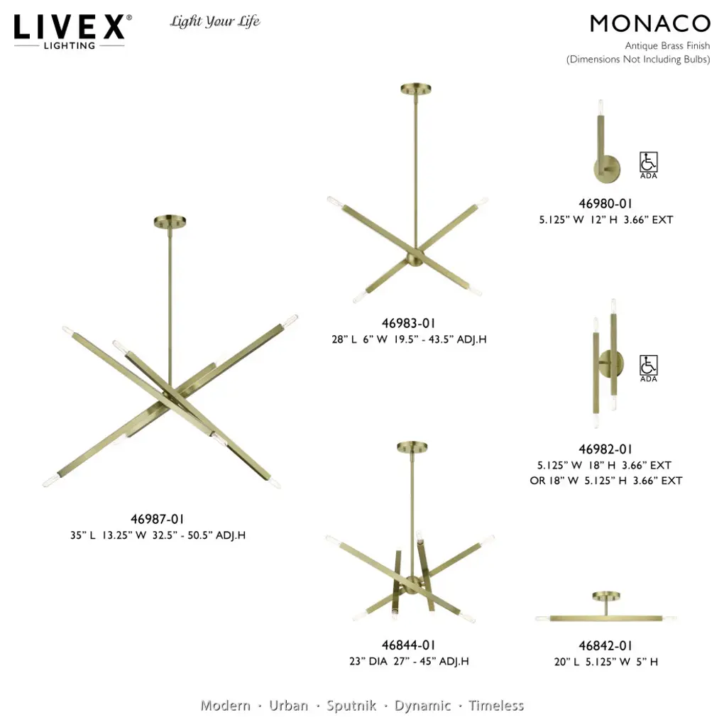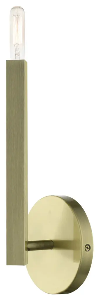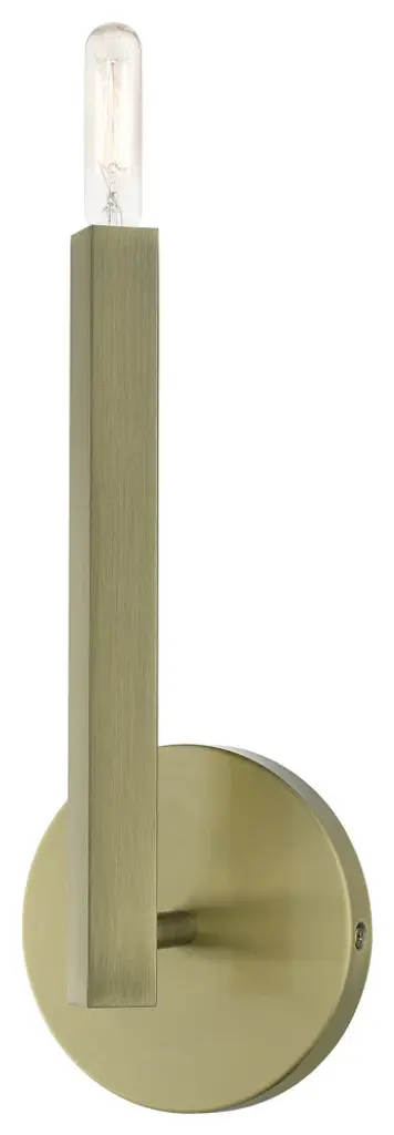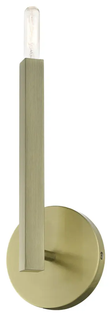 The Monaco collection inherits the multidirectional lines inspired by the Sputnik. The exposed bulb glimmers at the end of the rectangular arm to create a touch of understated glamour for today�s modern spaces. The timeless design will add a sense of airiness and motion to any room. This single light sconce would look wonderful anyplace; bathrooms, living rooms, modern dining rooms, hallways or bedrooms. It is presented in an antique brass finish.Number of Bulbs: 1Type of Bulb: Candelabra BaseMax Bulb Wattage: 60Bulbs Included: N