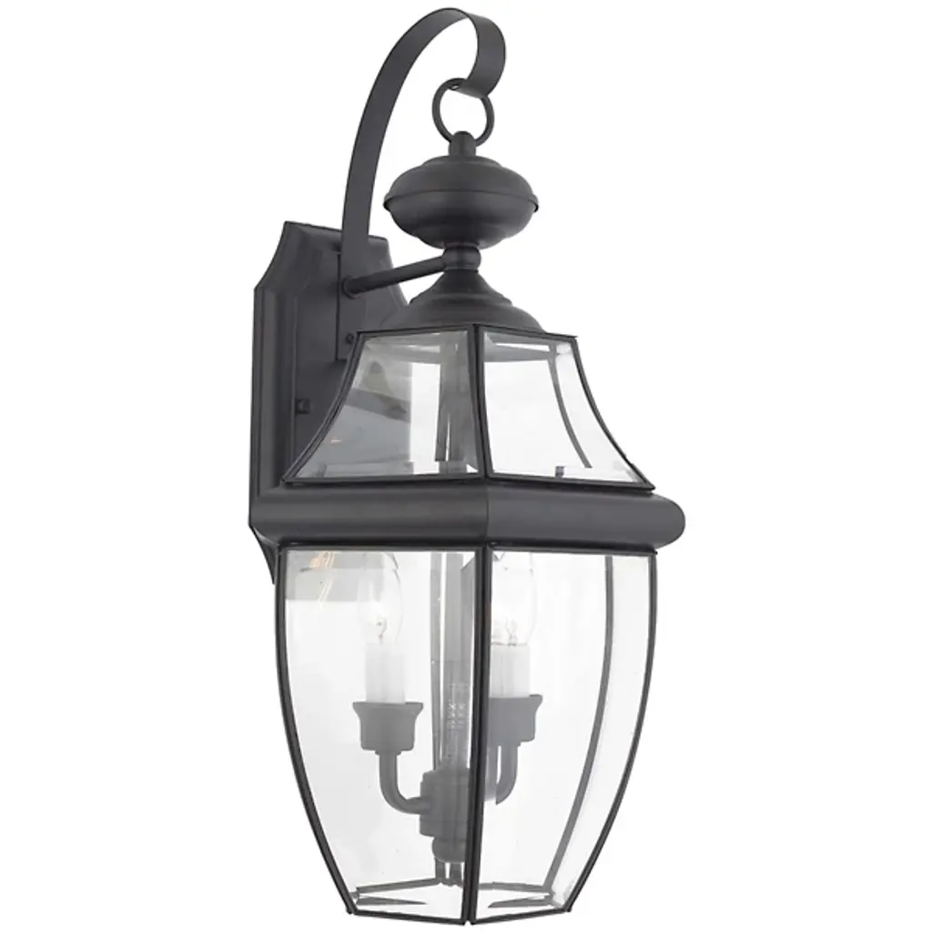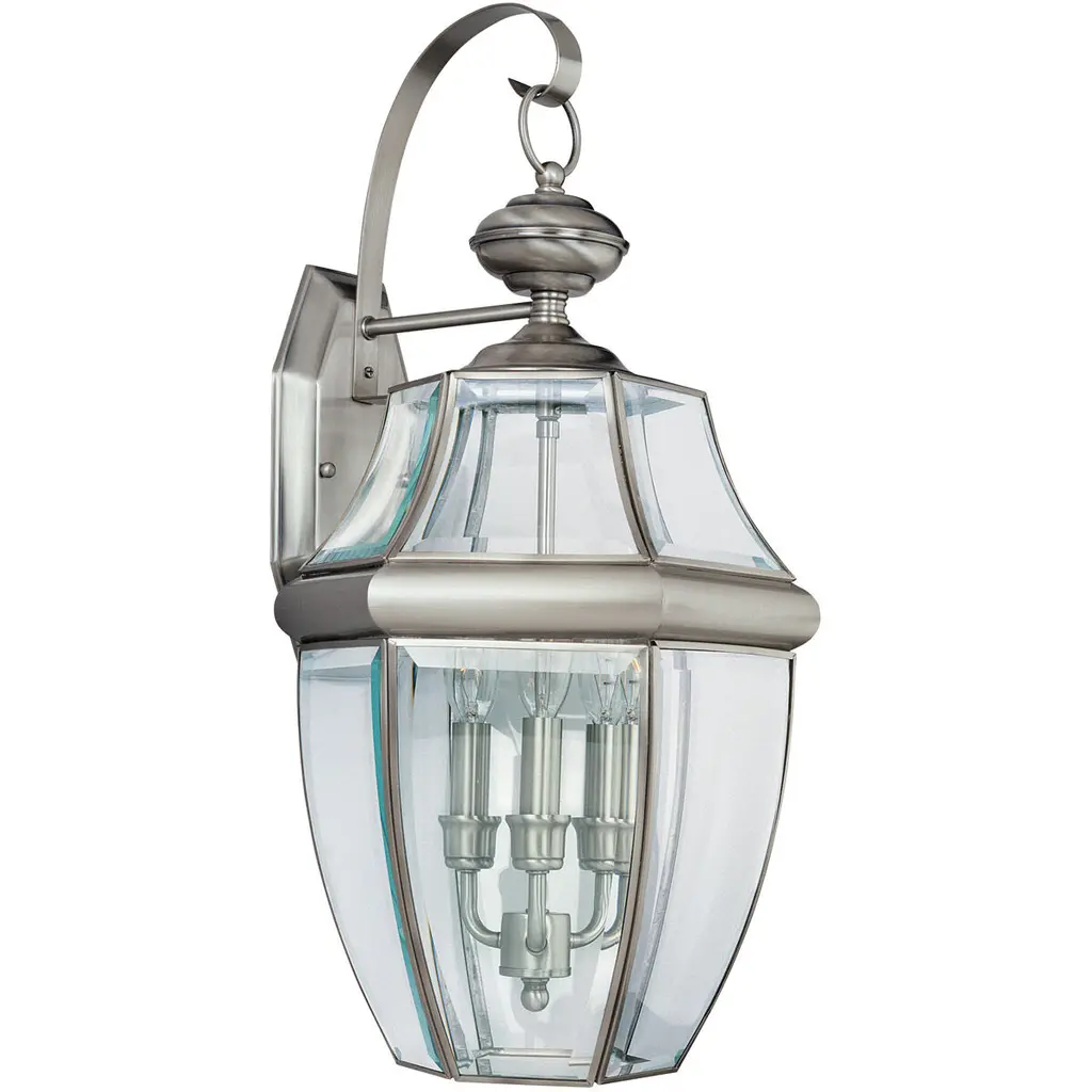 Collection: Monterey, Material: Brass, Finish Color: Brushed Nickel, Width: 12.5", Height: 22.5", Depth: 11.75", Height From Outlet Box: 9.5", Backplate Width: 4.5", Backplate Length: 9", Lamping Type: Incandescent, Number Of Bulbs: 3, Wattage: 60 Watts, Moisture Rating: Dry Rated, Desc: The Monterey outdoor lighting features clean, crisp lines complemented by the graceful curves of beveled glass. Crafted from sturdy solid brass this handsome colonial styling makes this fixture a perfect addition to your outdoor spaces.,