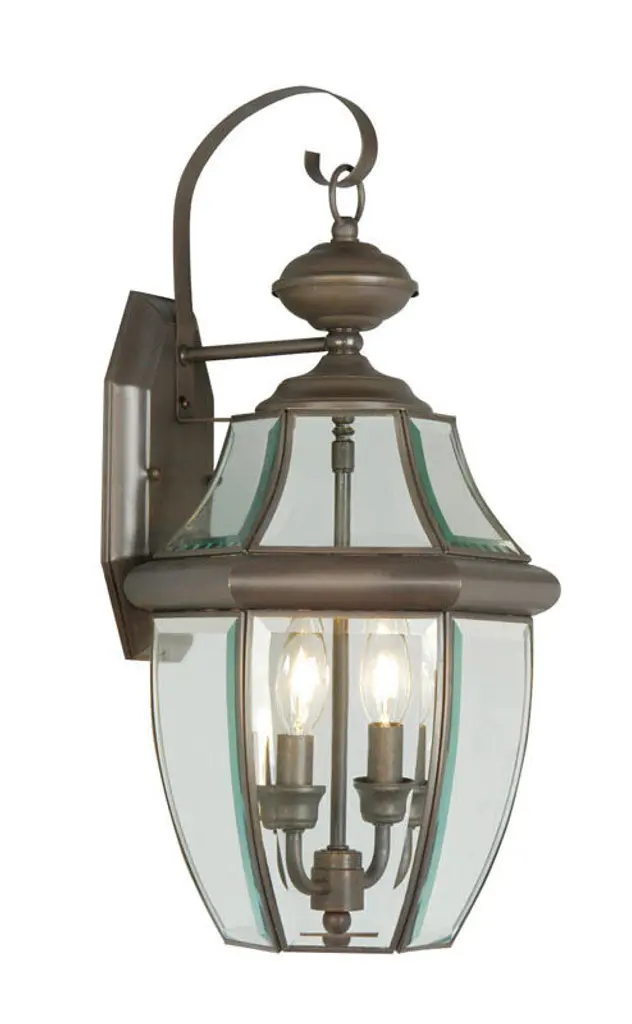 Collection: Monterey, Material: Brass, Finish Color: Verdigris, Width: 12.5", Height: 22.5", Depth: 11.75", Height From Outlet Box: 9.5", Backplate Width: 4.5", Backplate Length: 9", Lamping Type: Incandescent, Number Of Bulbs: 3, Wattage: 60 Watts, Moisture Rating: Dry Rated, Desc: The Monterey outdoor lighting features clean, crisp lines complemented by the graceful curves of beveled glass. Crafted from sturdy solid brass this handsome colonial styling makes this fixture a perfect addition to your outdoor spaces.,