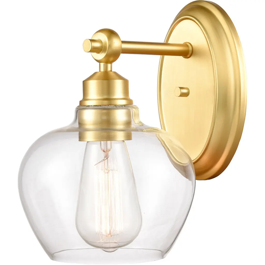 Collection: Montgomery, Material: Steel, Finish Color: Polished Brass, Width: 5.38", Height: 7", Depth: 7.5", Height From Outlet Box: 3.75", Backplate Width: 5.38", Backplate Length: 1", Lamping Type: Incandescent, Number Of Bulbs: 1, Wattage: 100 Watts, Moisture Rating: Dry Rated, Desc: Whether it's style or practical lighting, this vanity sconce is the perfect addition to your bathroom. This single-light fixture from the Montgomery Collection features a clear hand-blown glass shade and is shown in a black finish. The clean graceful lines of the back plate complement the shade, creating an understated look that works well in most decors. Classic elegance combines with contemporary appeal to enhance any home in style.,
