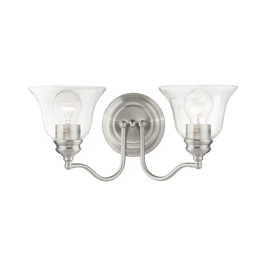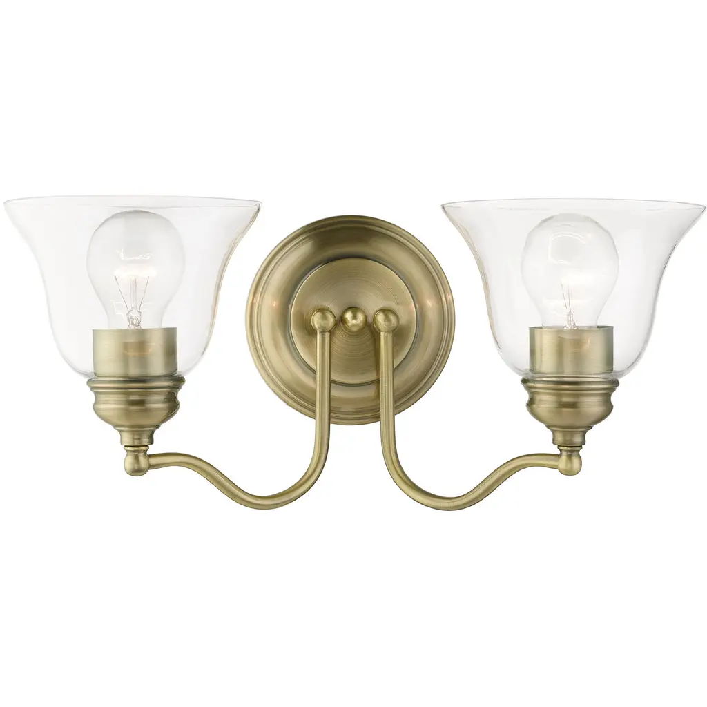 Collection: Moreland, Material: Steel, Finish Color: Polished Brass, Width: 15.25", Height: 7.5", Depth: 8", Height From Outlet Box: 4.5", Backplate Width: 5.38", Backplate Length: 1", Lamping Type: Incandescent, Number Of Bulbs: 2, Wattage: 60 Watts, Moisture Rating: Dry Rated, Desc: Bring a refined lighting style to your bath area with this Moreland collection two light vanity sconce. Shown in an antique brass finish and clear glass.,