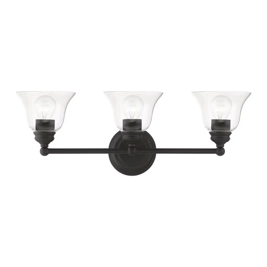Collection: Moreland, Material: Steel, Finish Color: Black, Width: 24", Height: 7.5", Depth: 8", Height From Outlet Box: 4.5", Backplate Width: 5.38", Backplate Length: 1", Lamping Type: Incandescent, Number Of Bulbs: 3, Wattage: 60 Watts, Moisture Rating: Dry Rated, Desc: Bring a refined lighting style to your bath area with this Moreland collection three light vanity sconce. Shown in an antique brass finish and clear glass.,