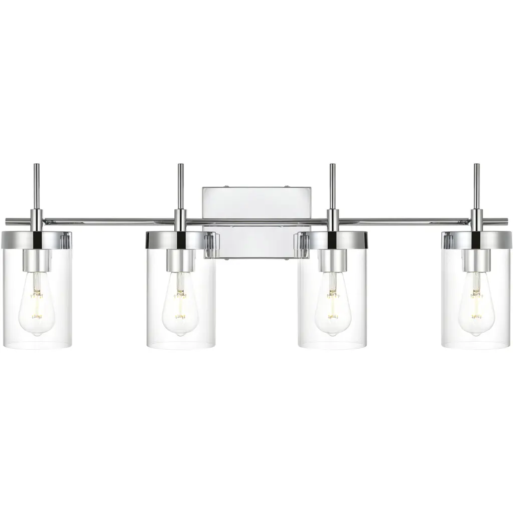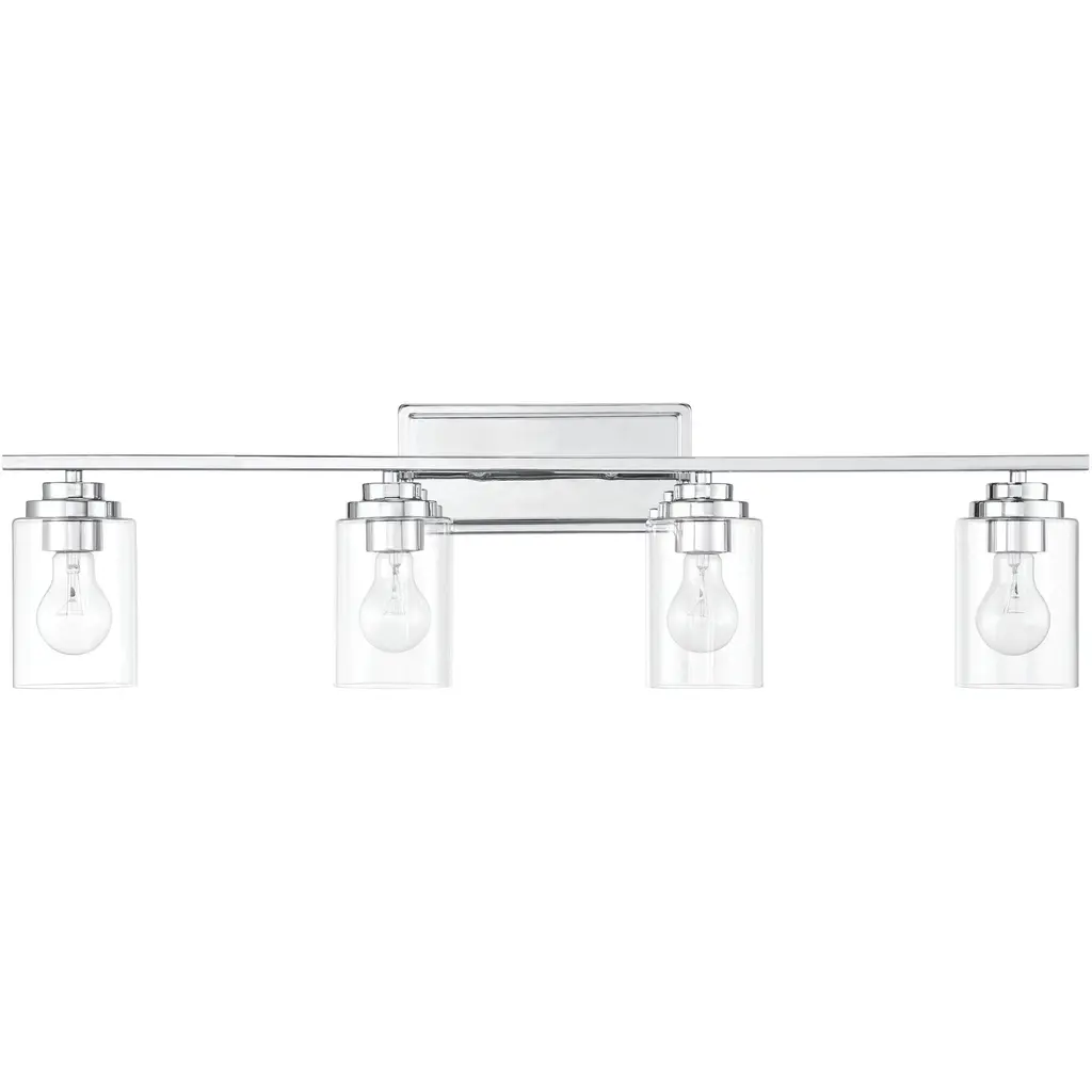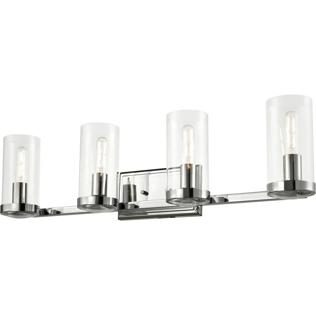 Collection: Munich, Material: Steel, Finish Color: Polished Chrome, Width: 35.5", Height: 8.5", Depth: 6.5", Height From Outlet Box: 6", Backplate Width: 5", Backplate Length: 0.75", Lamping Type: Incandescent, Number Of Bulbs: 4, Wattage: 60 Watts, Moisture Rating: Dry Rated, Desc: The Munich transitional four light vanity sconce will bring posh sophistication to your decor. The backplate and clear cylinder glass give this polished chrome finish a sleek, contemporary look.,