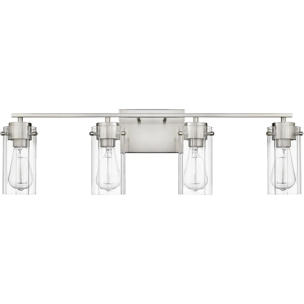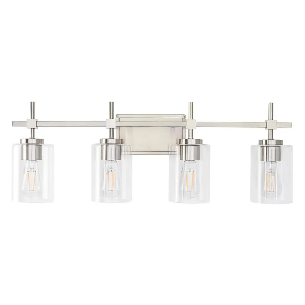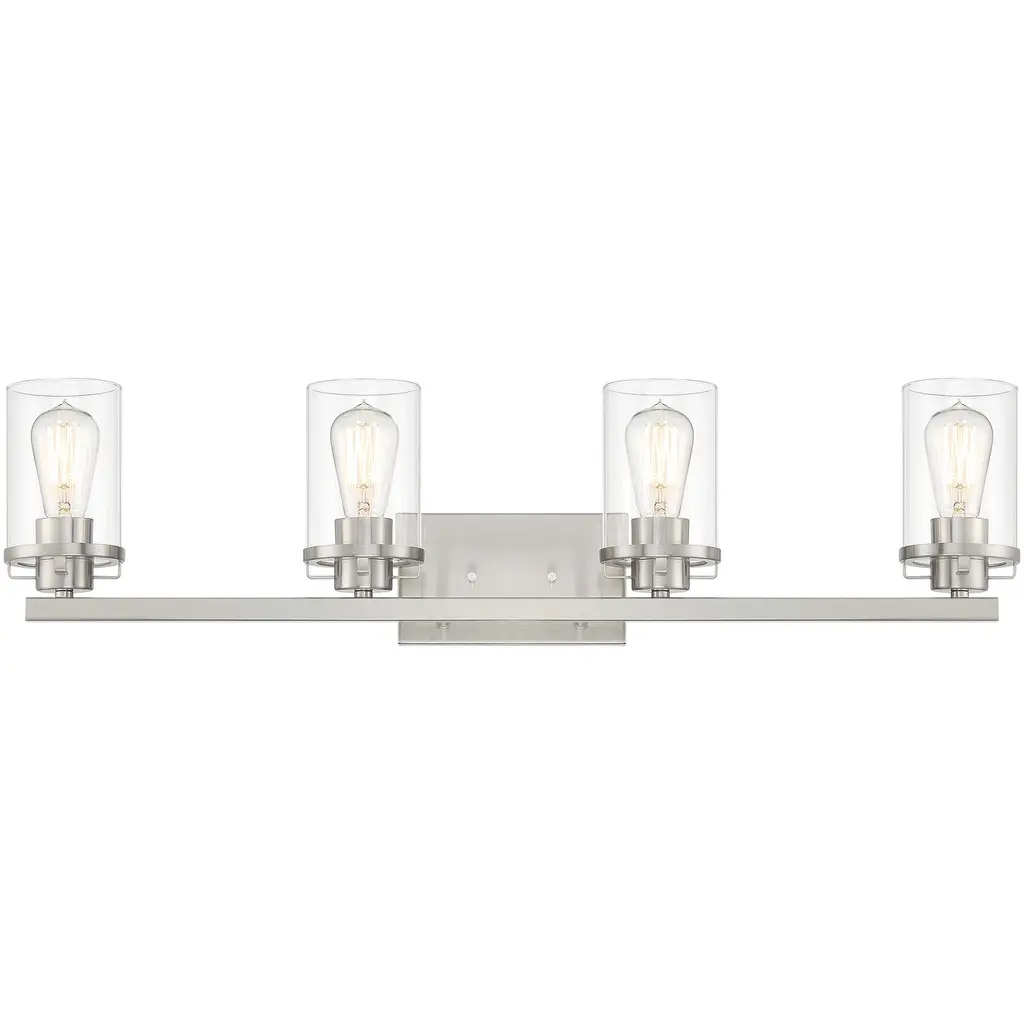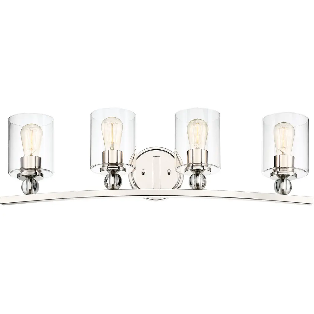 Collection: Munich, Material: Steel, Finish Color: Polished Chrome, Width: 35.5", Height: 8.5", Depth: 6.5", Height From Outlet Box: 6", Backplate Width: 5", Backplate Length: 0.75", Lamping Type: Incandescent, Number Of Bulbs: 4, Wattage: 60 Watts, Moisture Rating: Dry Rated, Desc: The Munich transitional four light vanity sconce will bring posh sophistication to your decor. The backplate and clear cylinder glass give this polished chrome finish a sleek, contemporary look.,