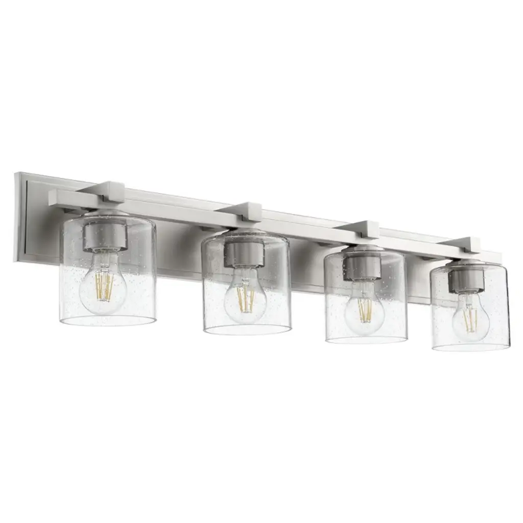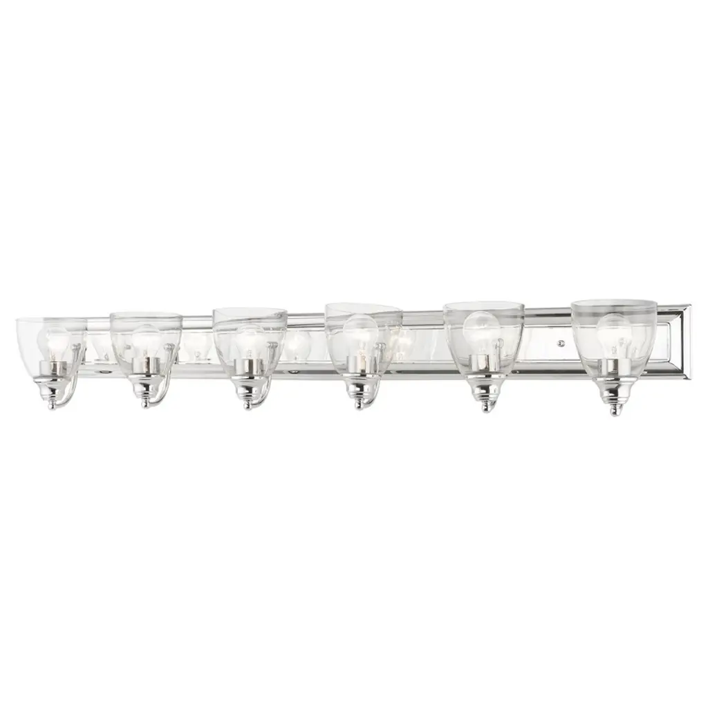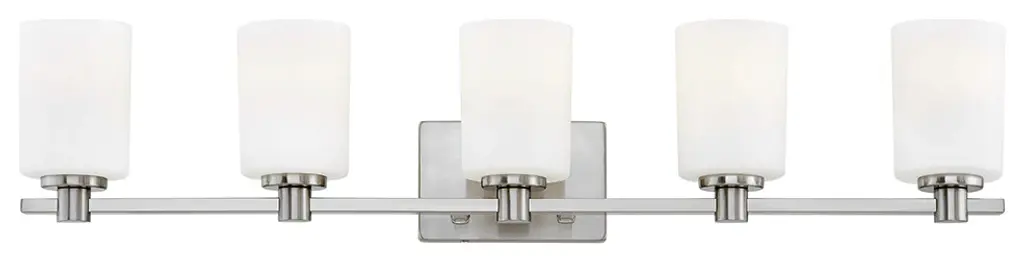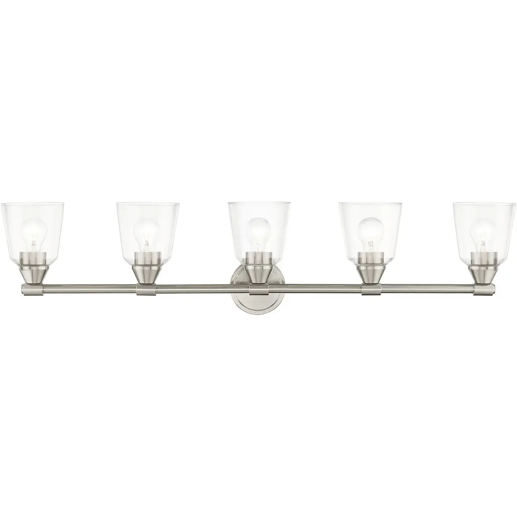 Collection: Munich, Material: Steel, Finish Color: Brushed Nickel, Width: 42", Height: 8.5", Depth: 6.5", Height From Outlet Box: 6", Backplate Width: 5", Backplate Length: 0.75", Lamping Type: Incandescent, Number Of Bulbs: 5, Wattage: 60 Watts, Moisture Rating: Dry Rated, Desc: The Munich transitional five light vanity sconce will bring posh sophistication to your decor. The backplate and clear cylinder glass give this polished chrome finish a sleek, contemporary look.,