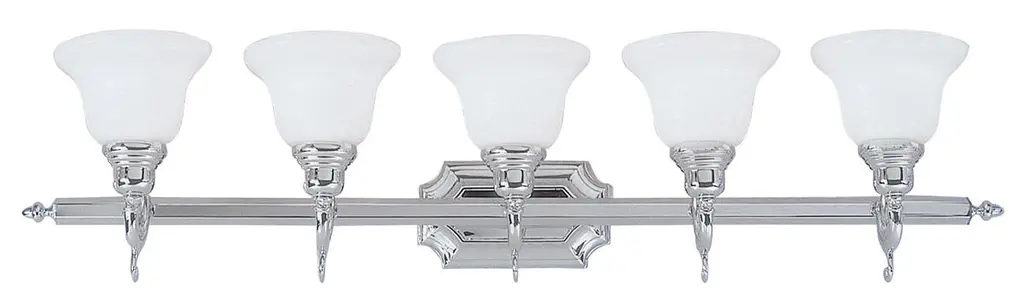 Collection: Neptune, Material: Steel, Finish Color: Polished Chrome, Width: 32", Height: 8.63", Depth: 6.75", Height From Outlet Box: 5.5", Backplate Width: 4.75", Lamping Type: Incandescent, Number Of Bulbs: 5, Wattage: 100 Watts, Moisture Rating: Dry Rated, Desc: This clean and classic bath fixture design is ideal for bringing a bright new style to your bathroom space. It features a brushed nickel finish along with white alabaster glass. Mounting Direction: Up/Down / Shade Included: Yes. ,