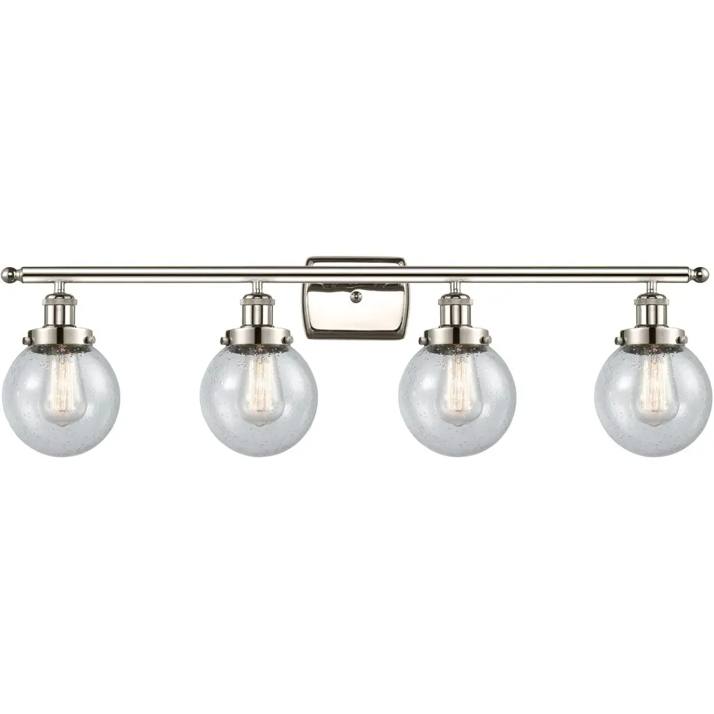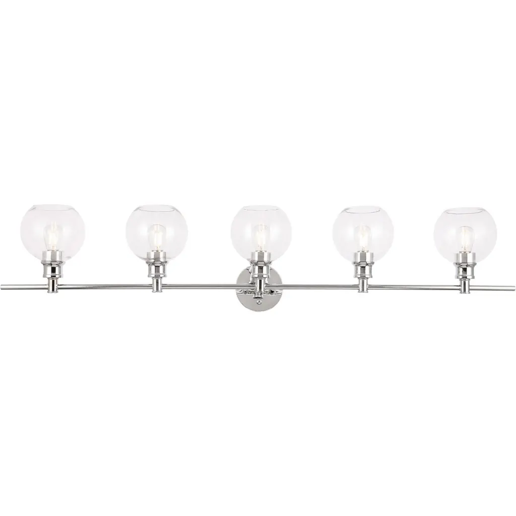 Collection: Oldwick, Material: Steel, Finish Color: Polished Chrome, Width: 42", Height: 8.25", Depth: 7.25", Height From Outlet Box: 4.5", Backplate Width: 5.13", Backplate Length: 1", Lamping Type: Incandescent, Number Of Bulbs: 5, Wattage: 75 Watts, Moisture Rating: Dry Rated, Desc: Sleek and simple lines define this beautiful polished brass finish five light large vanity sconce from the Oldwick collection. The clean, bold look of modernity blends with a raw industrial inspiration and hand blown clear glass give this design a versatile and eclectic look that works with nearly any style of home decor.,