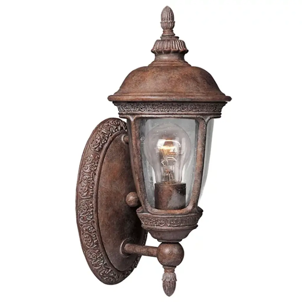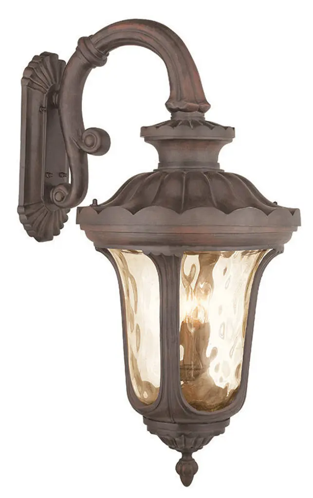 Collection: Oxford, Material: Aluminum, Finish Color: Imperial Bronze, Width: 7.25", Height: 15.5", Depth: 8.75", Height From Outlet Box: 10.75", Backplate Width: 4.5", Backplate Length: 8.5", Lamping Type: Incandescent, Number Of Bulbs: 1, Wattage: 100 Watts, Moisture Rating: Wet Rated, Desc: From the Oxford outdoor lantern collection, this traditional design will add curb appeal to any home. It features a handsome, antique-style wall plate and decorative arm. Light amber water glass cast an appealing light and lends to its vintage charm. Wall plate, arm and other details are all in a moroccan gold finish. Shade Included: Yes. ,
