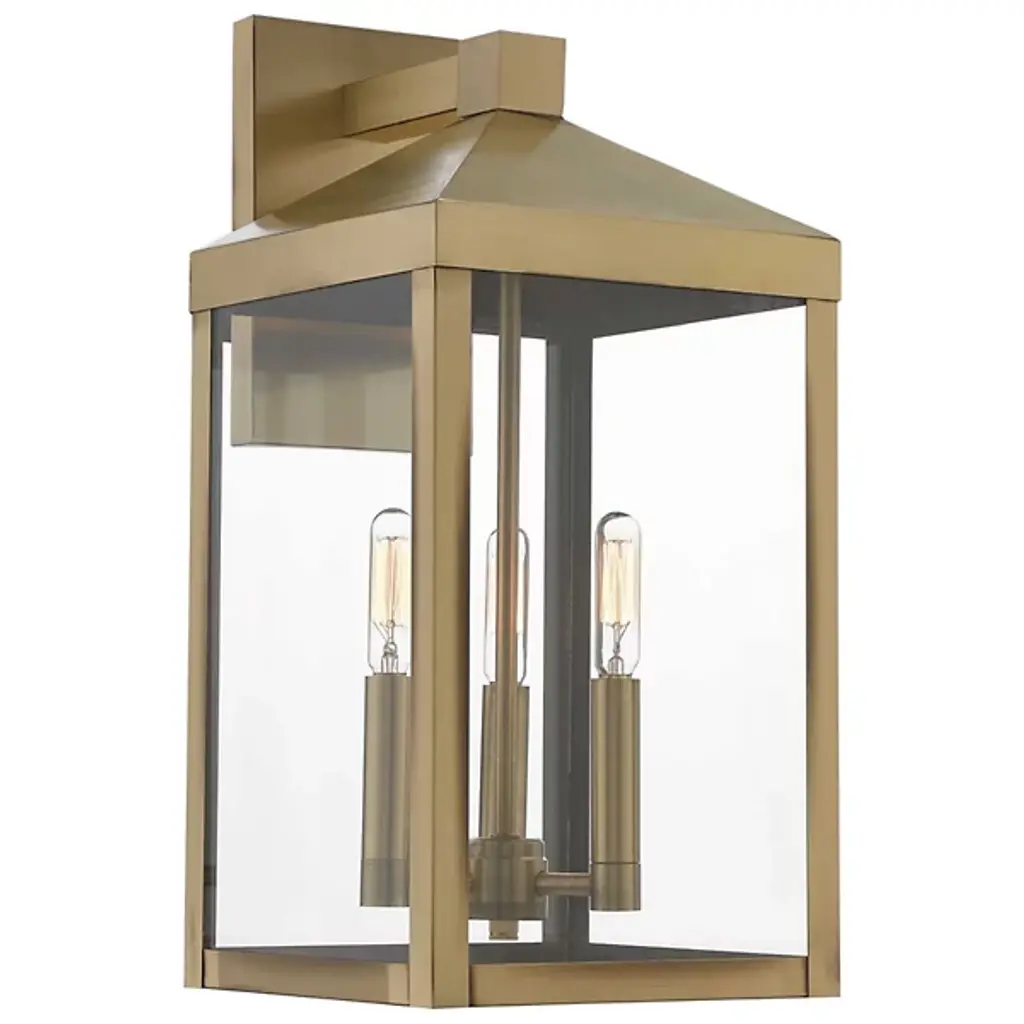 Collection: Princeton, Material: Brass, Finish Color: Antique Brass, Width: 9.5", Height: 15.25", Depth: 5.75", Height From Outlet Box: 7", Backplate Width: 5", Backplate Length: 6", Lamping Type: Incandescent, Number Of Bulbs: 2, Wattage: 60 Watts, Moisture Rating: Dry Rated, Desc: The Princeton collection is a fresh interpretation on the classic English pocket lantern. Hand crafted solid brass, our Princeton fixtures are built for lasting beauty. This outdoor wall light features an antique brass finish and clear glass. This old world charm is built to last. Shade Included: Yes. ,