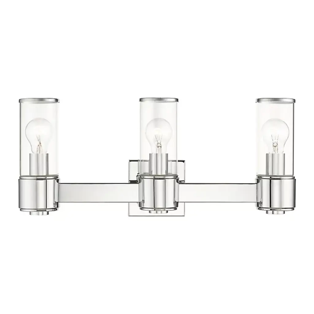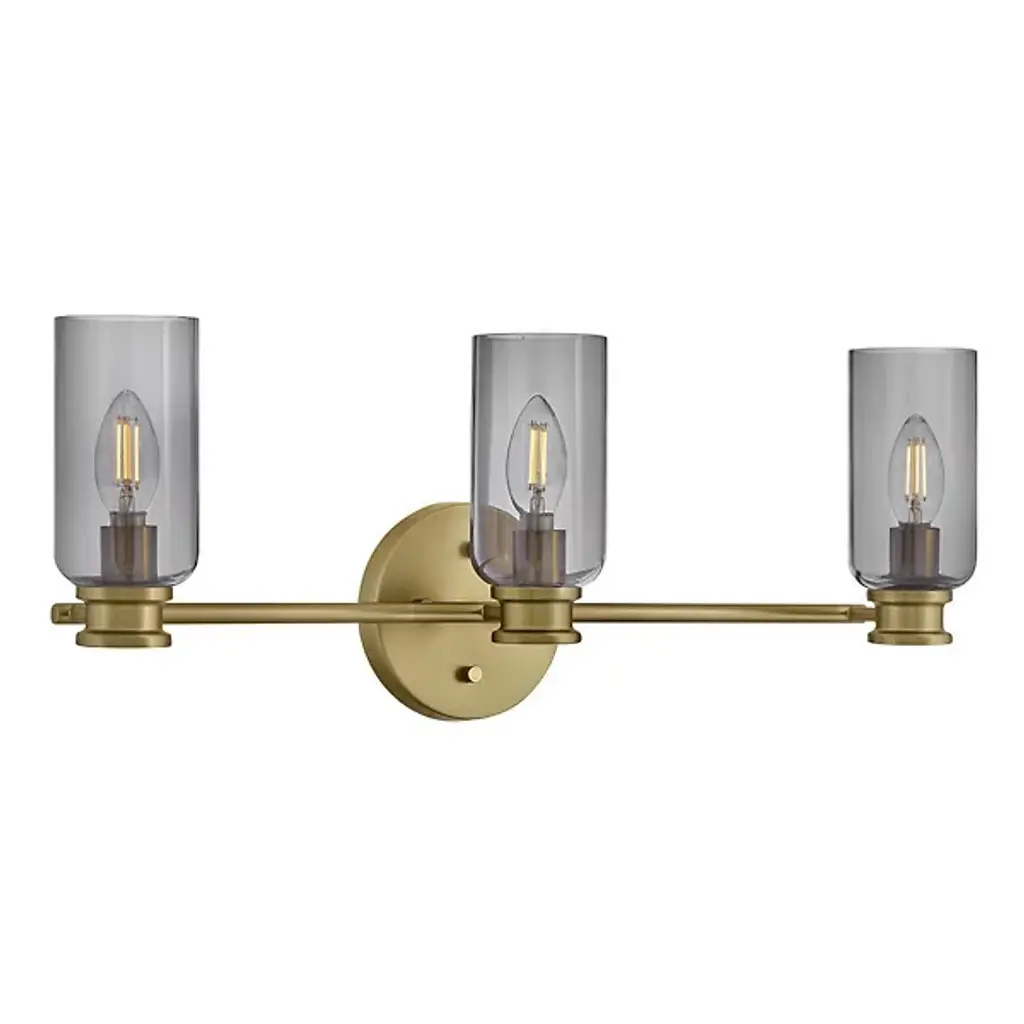 Collection: Quincy, Material: Steel, Finish Color: Polished Brass, Width: 22.5", Height: 9.75", Depth: 4", Height From Outlet Box: 7.38", Backplate Width: 4.75", Backplate Length: 4.75", Lamping Type: Incandescent, Number Of Bulbs: 3, Wattage: 60 Watts, Moisture Rating: Dry Rated, Desc: The stunning Quincy vanity sconce features a polished brass finish with clear glass. This sleek design will brighten up any bathroom.,