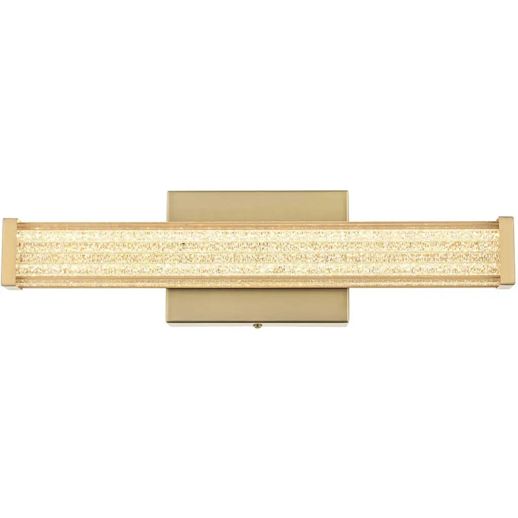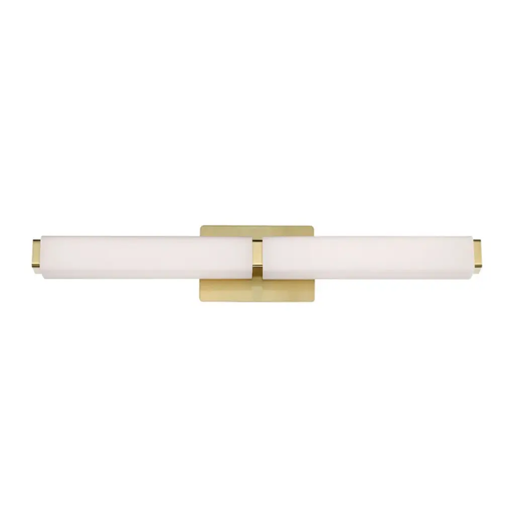 Collection: Soma, Material: Steel, Finish Color: Satin Brass, Width: 18", Height: 5", Depth: 3.88", Height From Outlet Box: 9", Backplate Width: 5", Backplate Length: 0.25", Lamping Type: Incandescent, Number Of Bulbs: 2, Wattage: 60 Watts, Moisture Rating: Dry Rated, Desc: Inspired by the modern skyscraper design, the architectural lines of the Soma collection are truly suitable for urban and contemporary environments such as an industrial loft. The exposed bulbs make a beautiful accompaniment to the distinctive contrasting finishes of this rectilinear piece. This contemporary two light vanity sconce comes in a polished chrome finish with a shiny white finish inside. It fits perfectly in a minimalistic modern bathroom, hallway or living room. Mounting Direction: Up or Down / Shade Included: Yes. ,