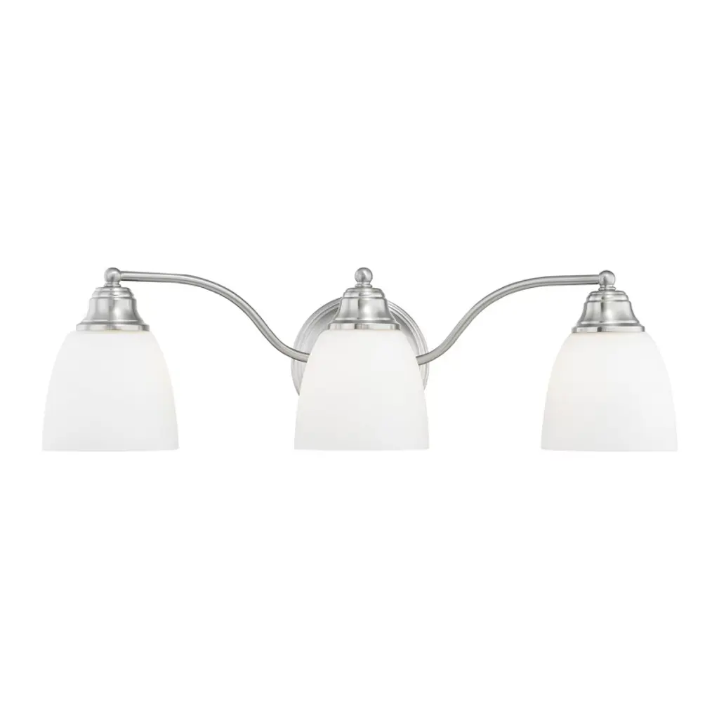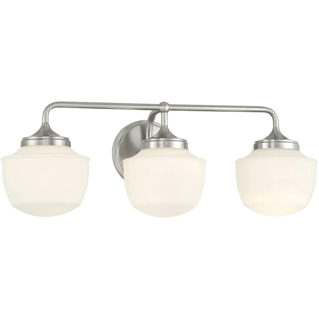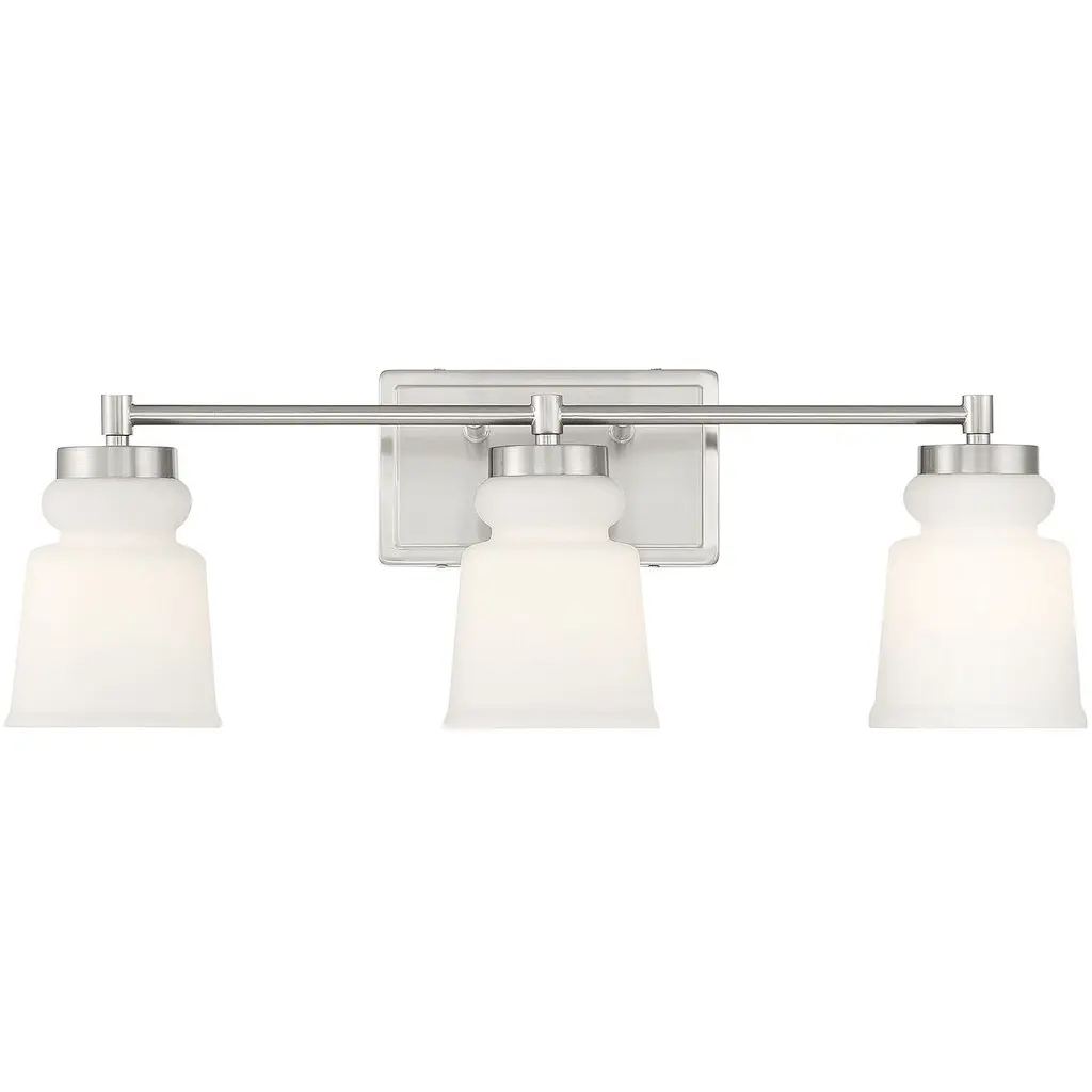 Collection: Somerville, Material: Steel, Finish Color: Brushed Nickel, Width: 23", Height: 9", Depth: 6.5", Height From Outlet Box: 6.25", Backplate Width: 5.5", Backplate Length: 5.5", Lamping Type: Incandescent, Number Of Bulbs: 3, Wattage: 100 Watts, Moisture Rating: Dry Rated, Desc: Not quite contemporary, not fully traditional. Intriguing concepts of basic shapes complement a brushed nickel finish and hand blown satin opal white glass. May be installed with glass facing up or down. Mounting Direction: Up/Down / Shade Included: Yes. ,