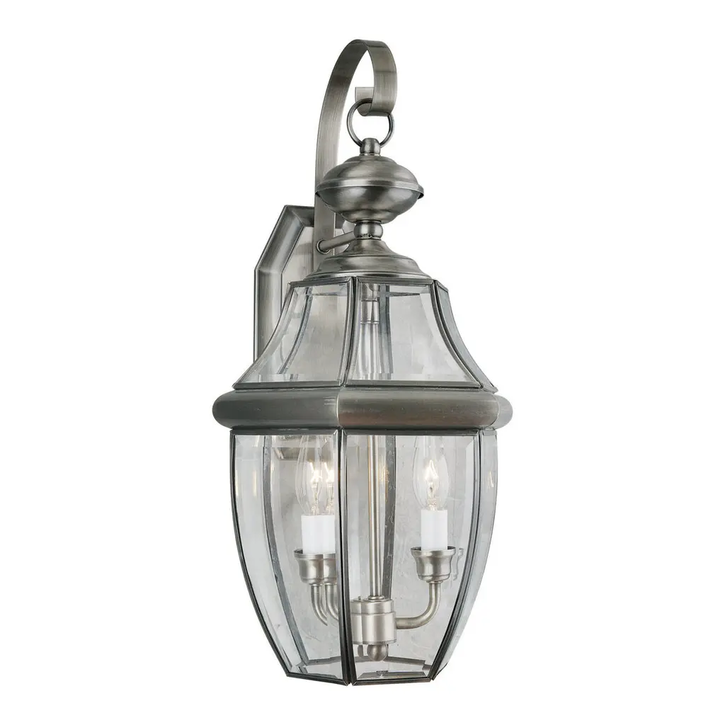 Collection: Westover, Material: Brass, Finish Color: Brushed Nickel, Width: 9", Height: 16.5", Depth: 10", Height From Outlet Box: 7.5", Backplate Width: 4.5", Backplate Length: 7", Lamping Type: Incandescent, Number Of Bulbs: 2, Wattage: 60 Watts, Moisture Rating: Dry Rated, Desc: Inspired by the historic look and romantic feel of gas-burning lamps, the Westover collection is reminiscent of antique gas lights still popular in Southern cities like Charleston and New Orleans. This solid brass piece features two lights behind large panes of clear beveled glass.,